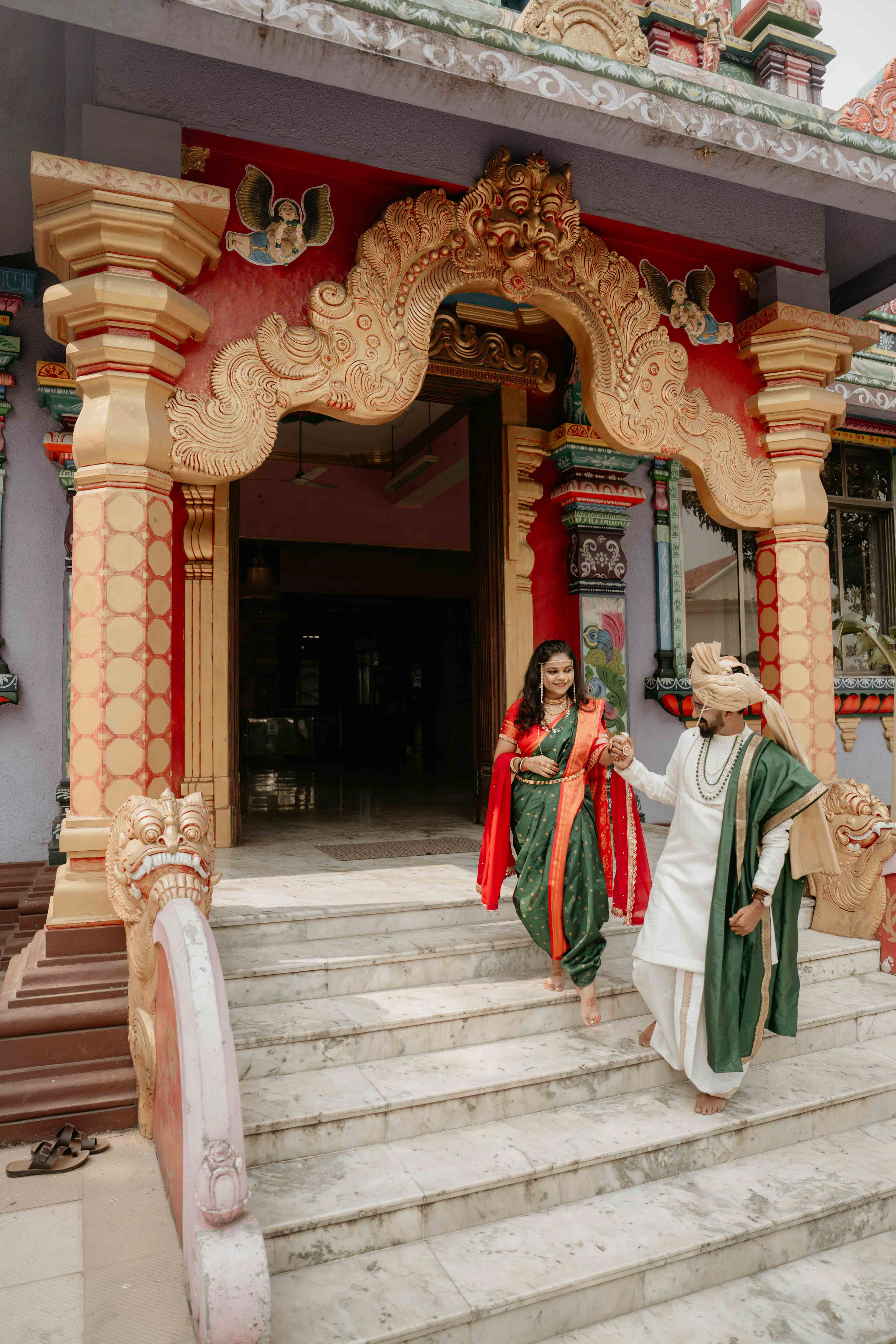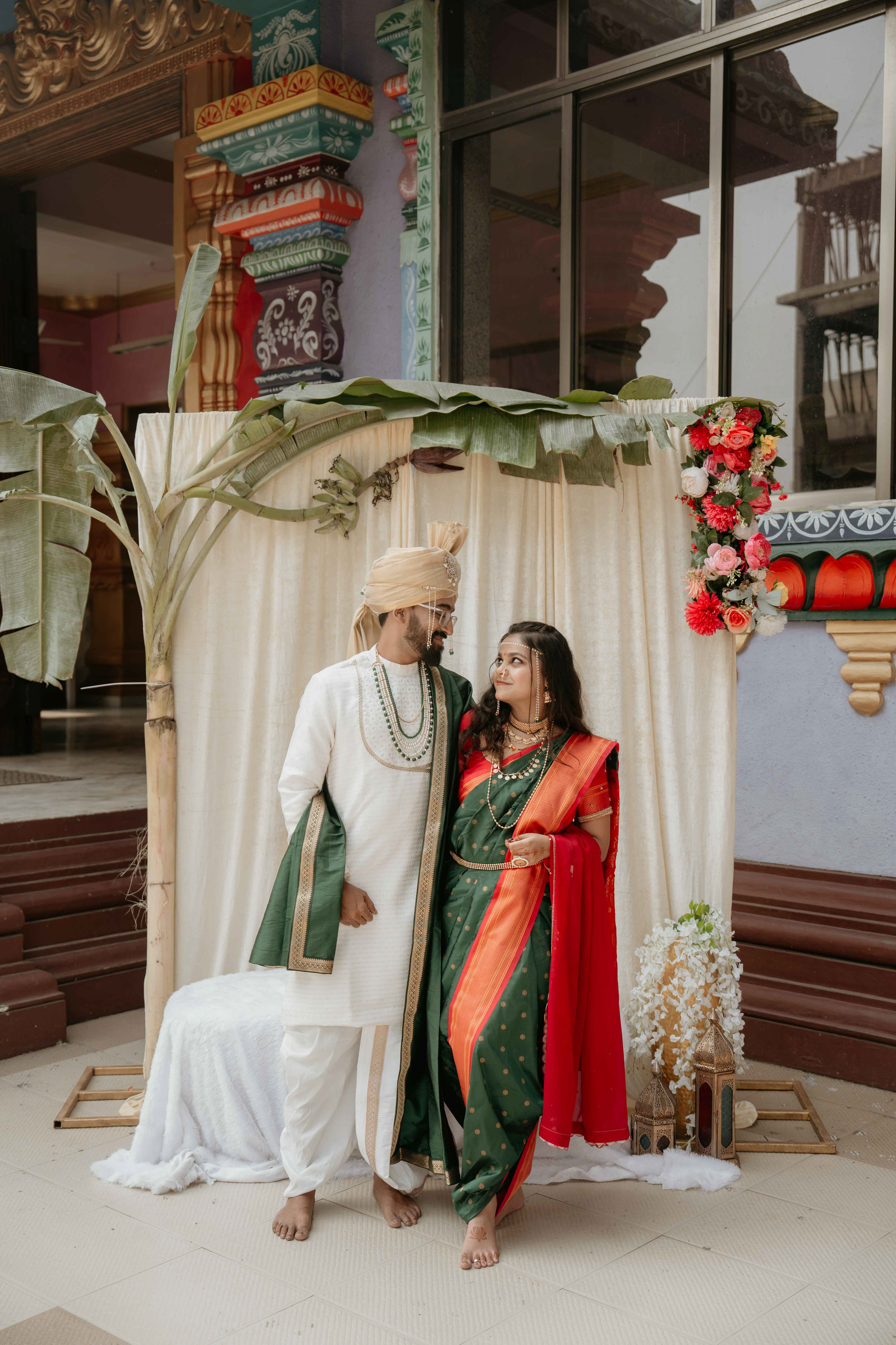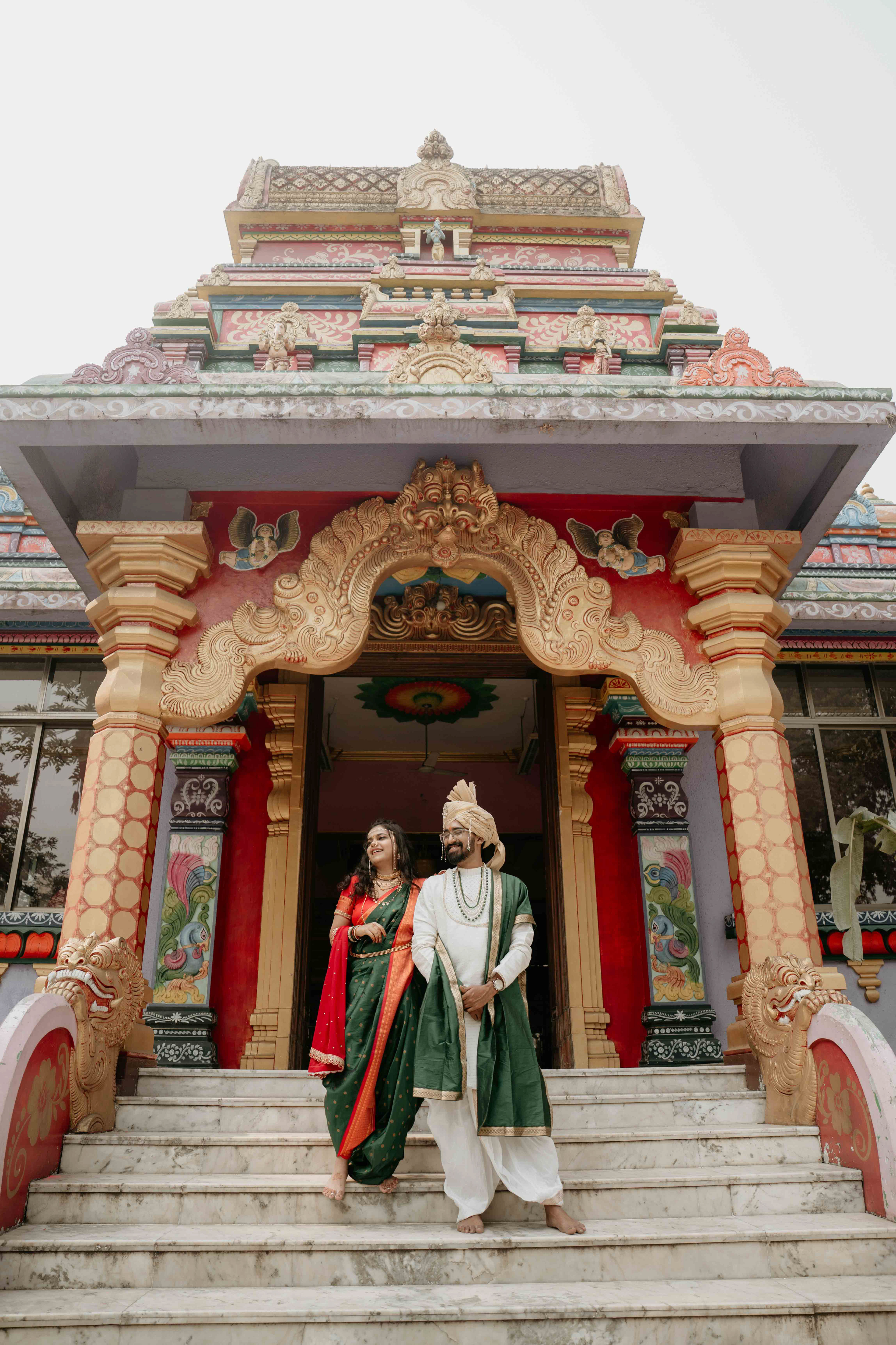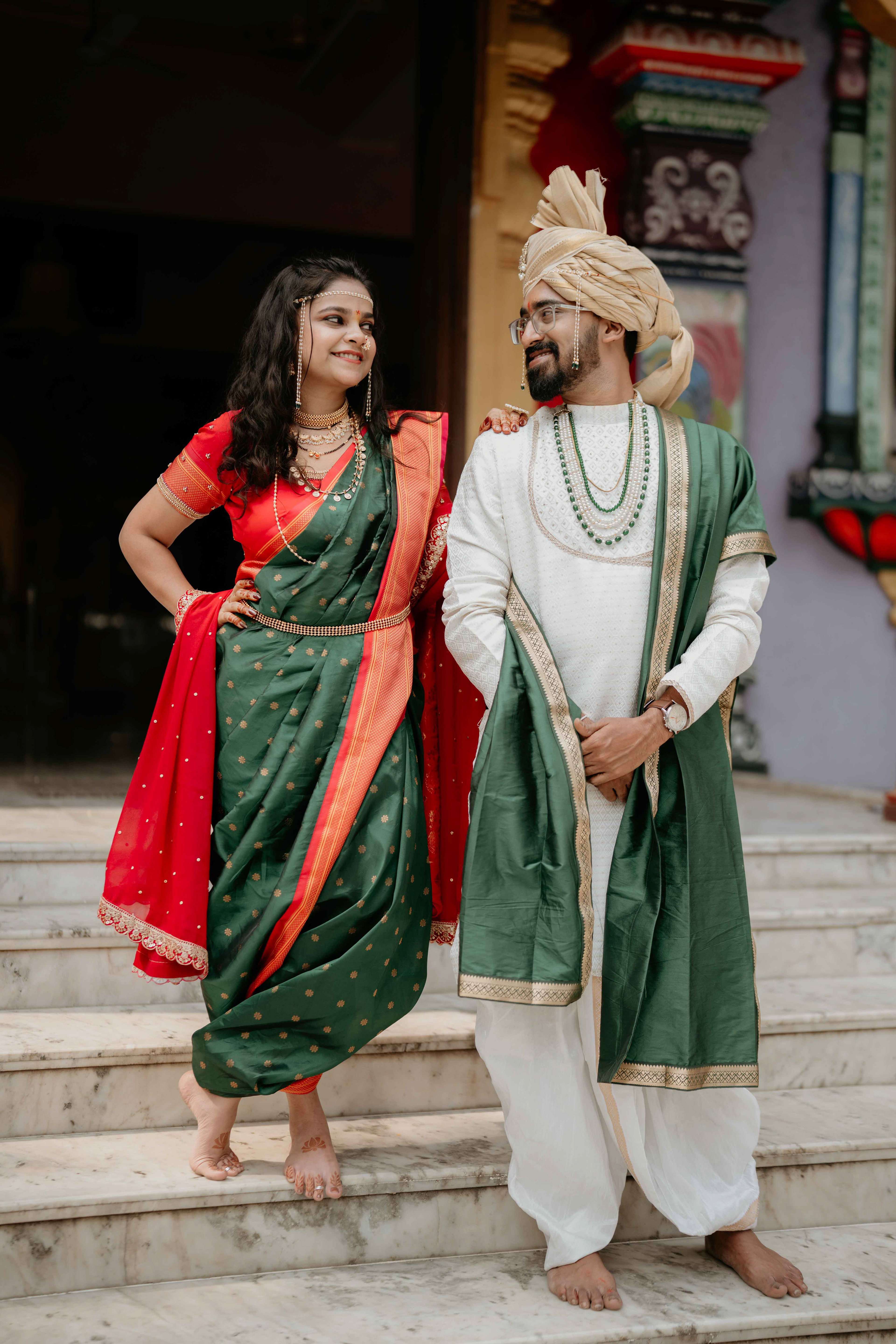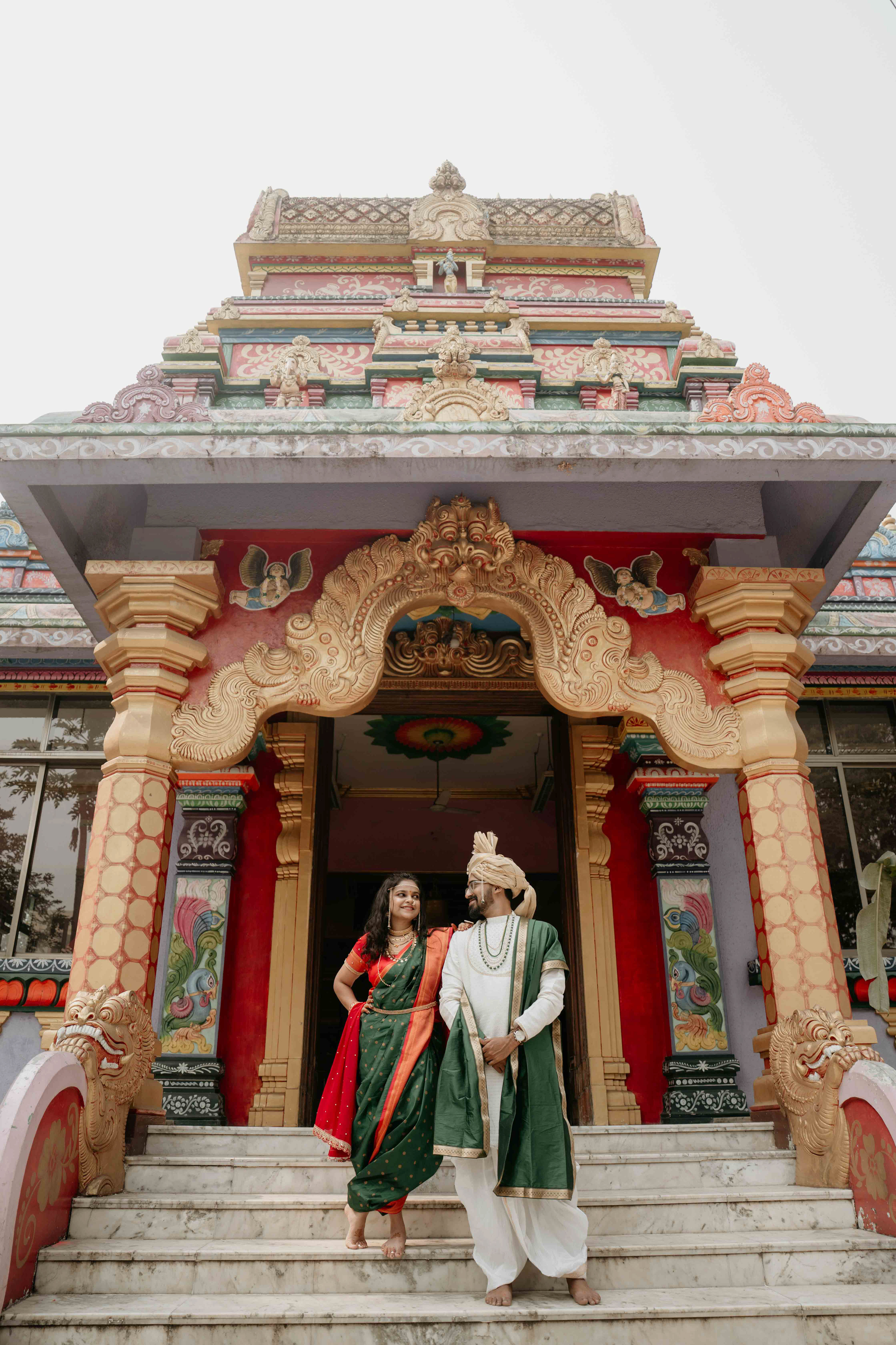 Standing beneath the intricately carved Gopuram, the couple perfectly mirrored the temple’s elegance. Deepali, draped in a rich forest green Nauvari, and Abhinav, in his classic white and green traditional attire, brought a sense of calm and grace to the vivid red and gold temple pillars.