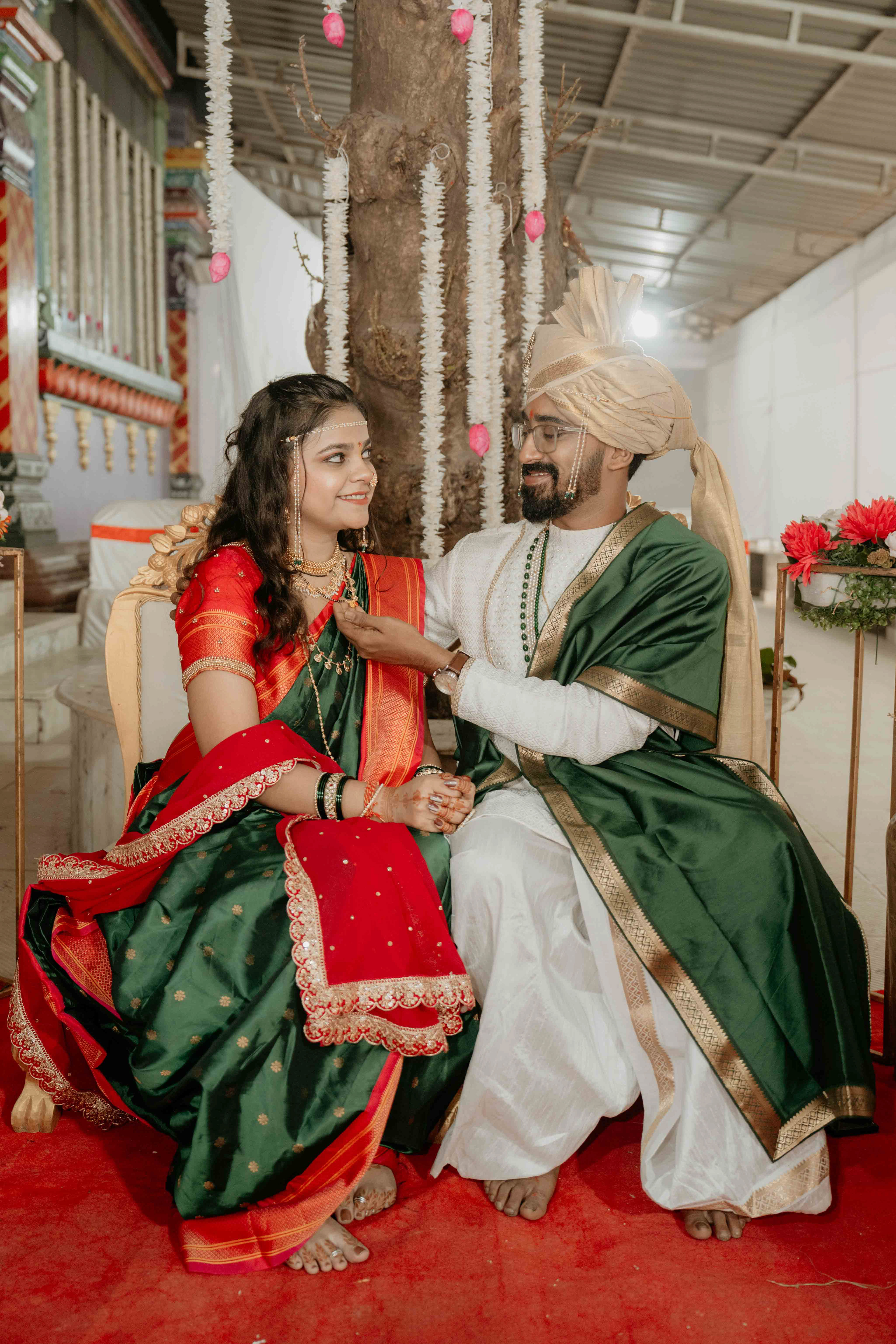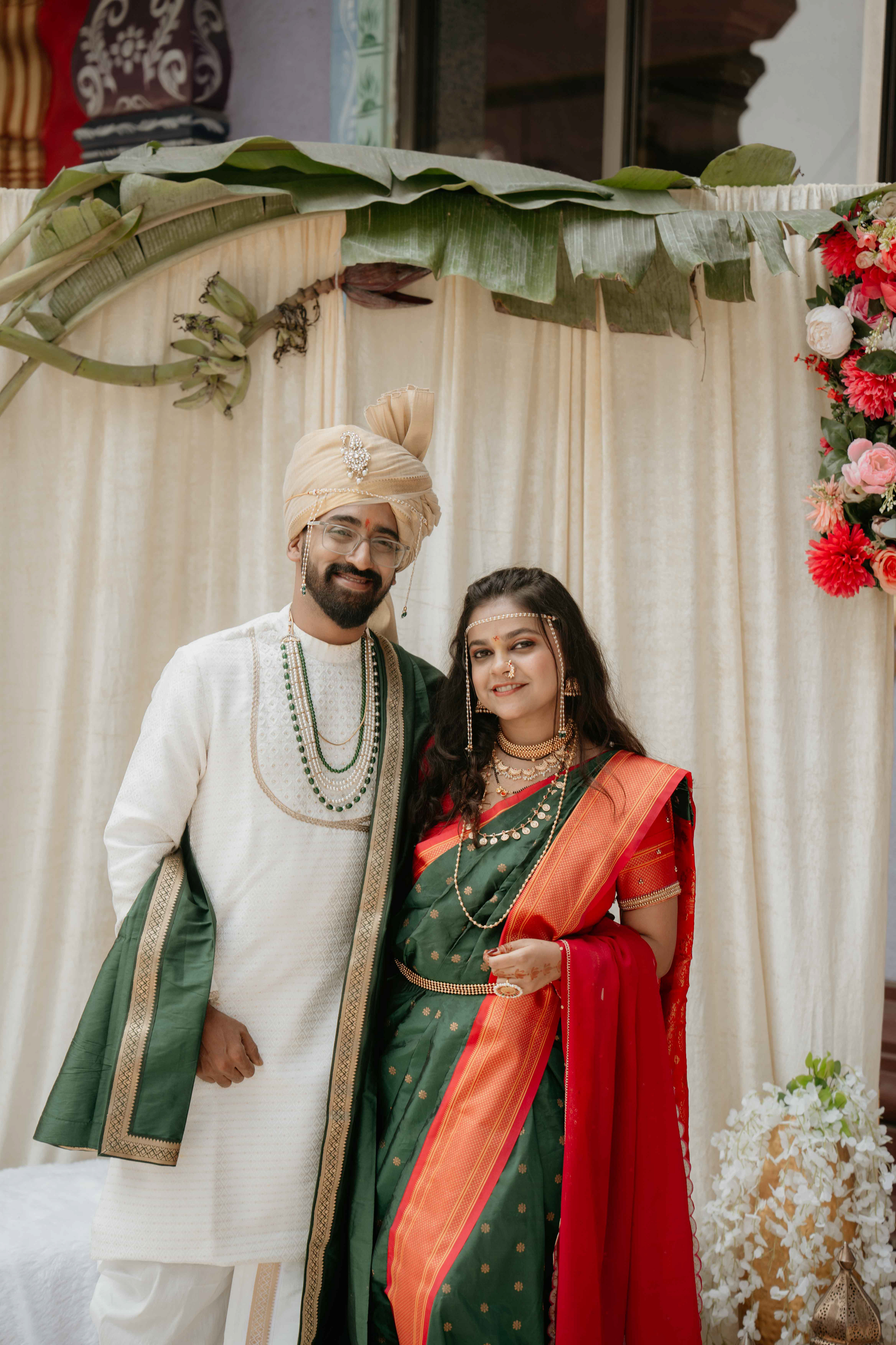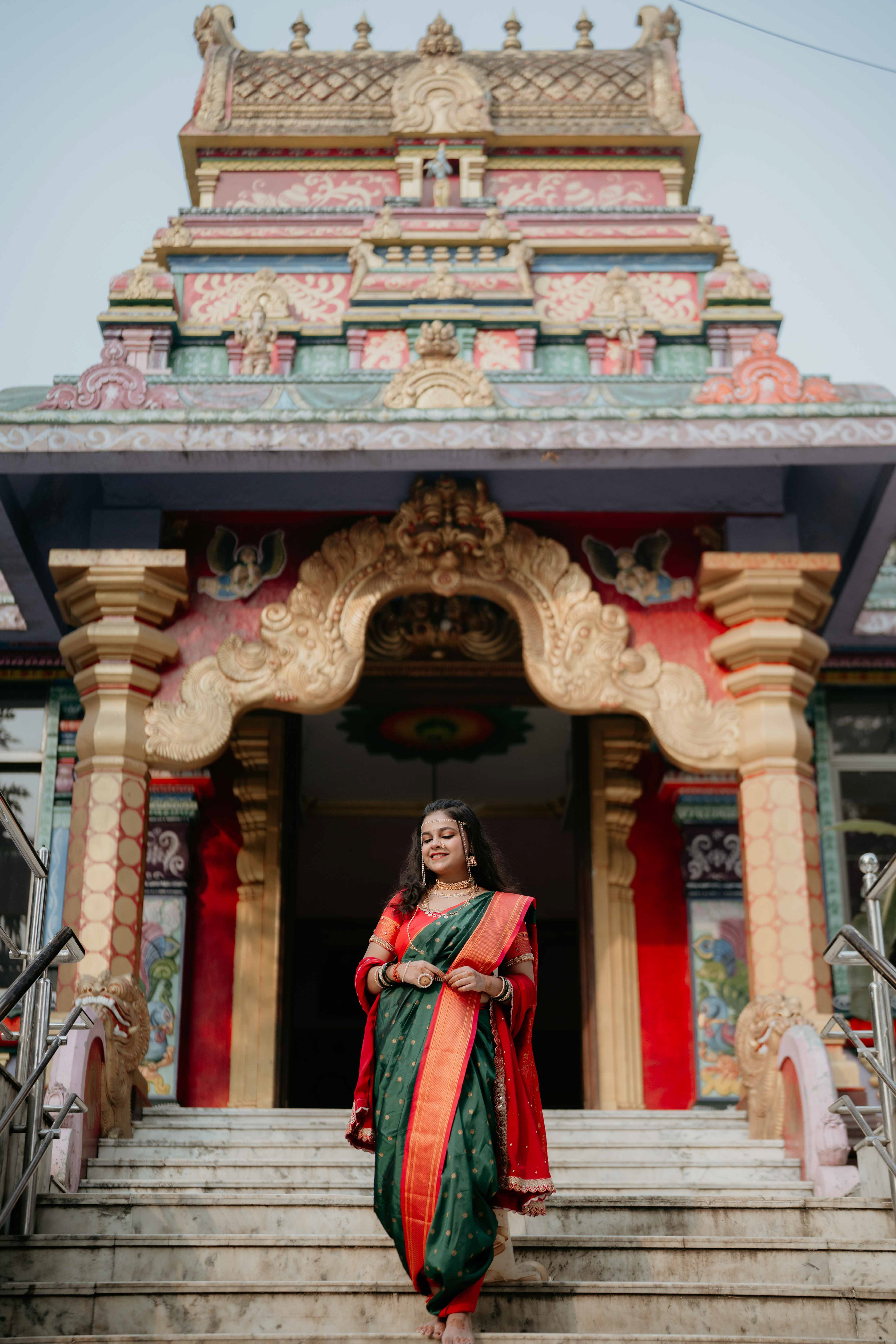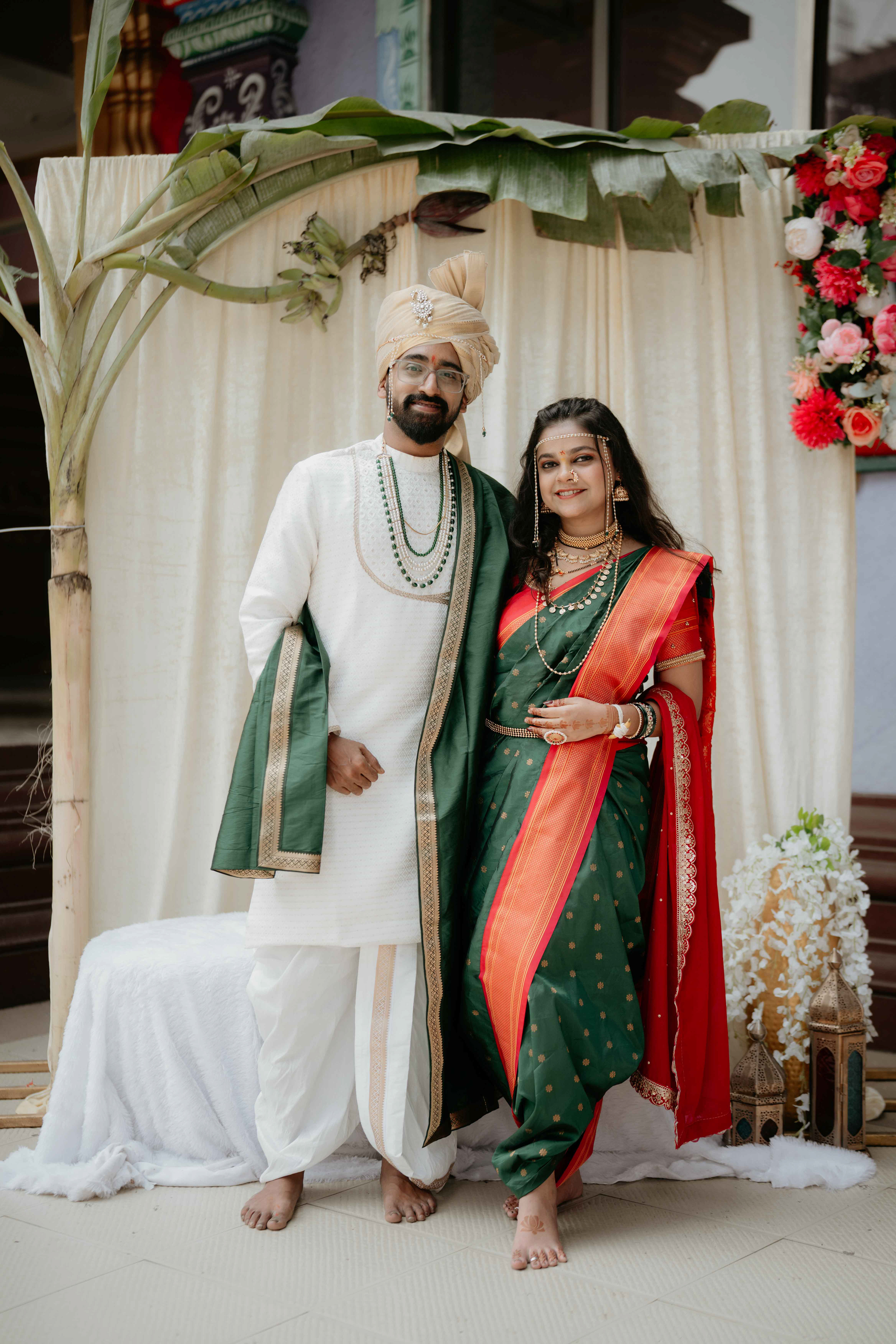 Standing beneath the intricately carved Gopuram, the couple perfectly mirrored the temple’s elegance. Deepali, draped in a rich forest green Nauvari, and Abhinav, in his classic white and green traditional attire, brought a sense of calm and grace to the vivid red and gold temple pillars.