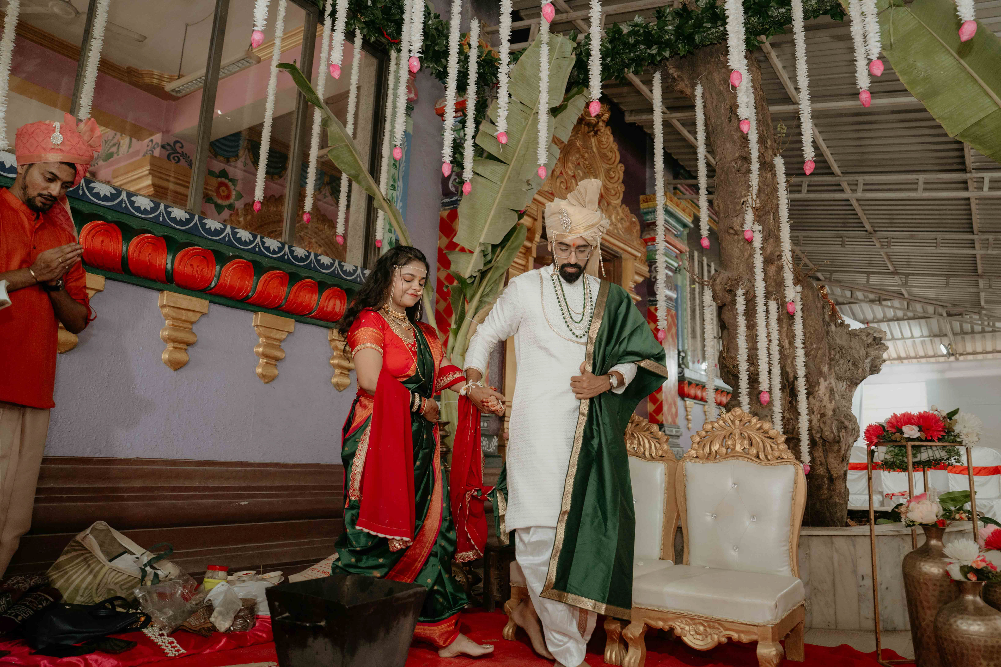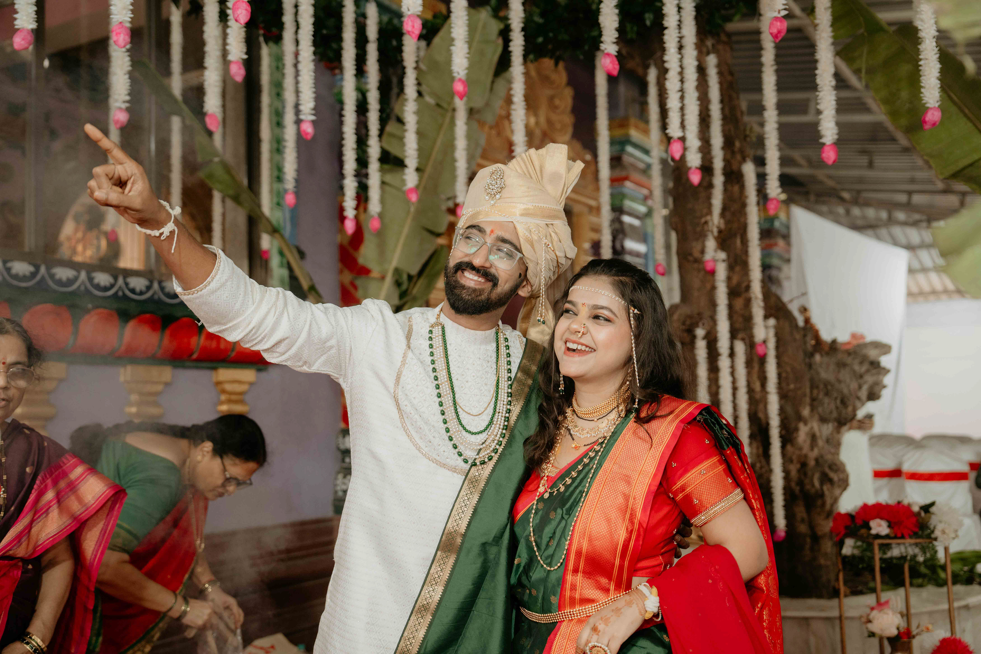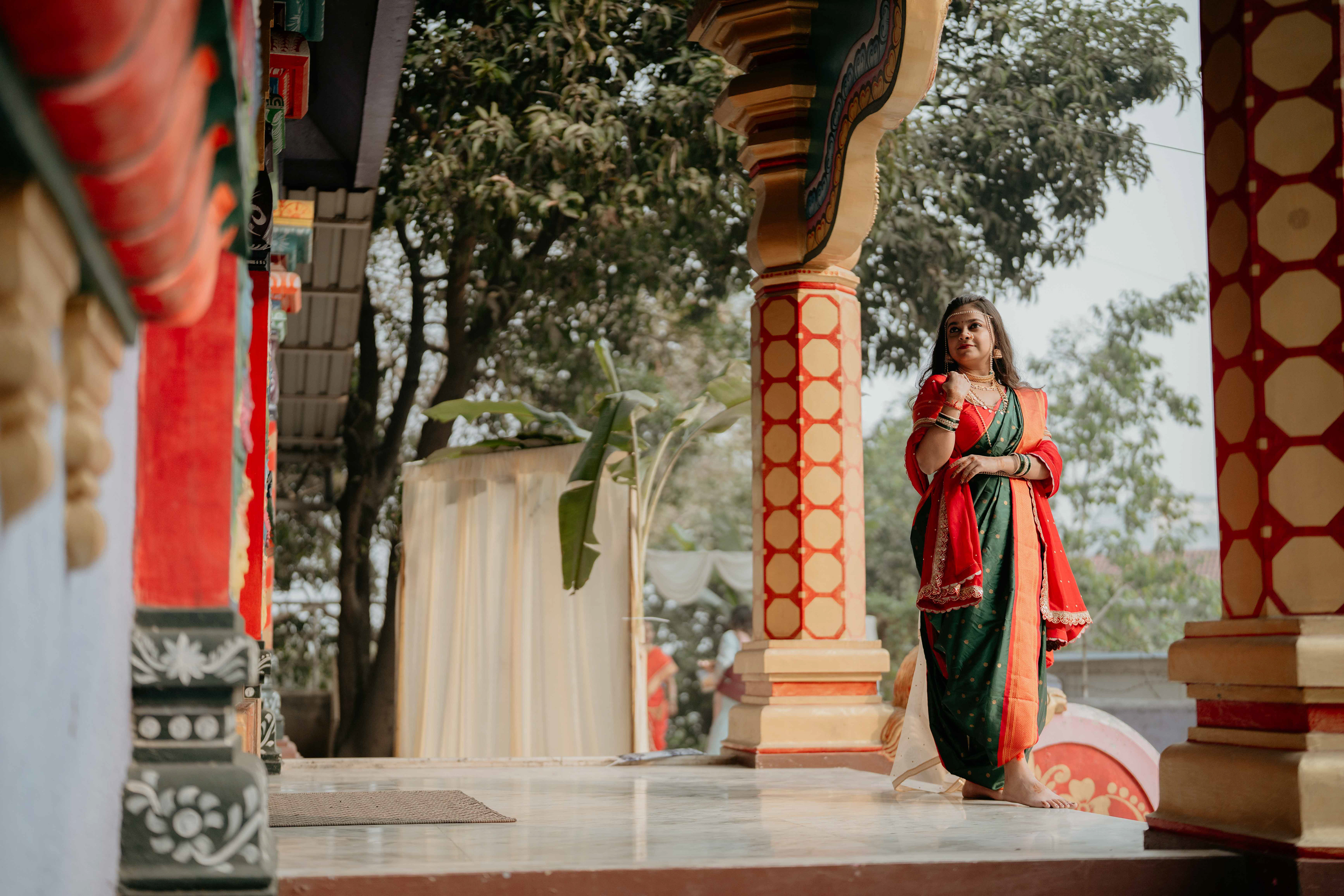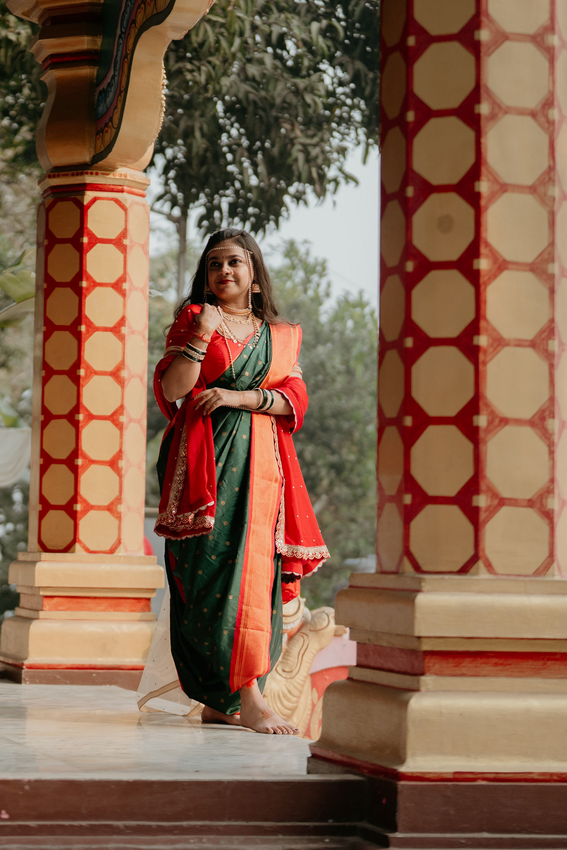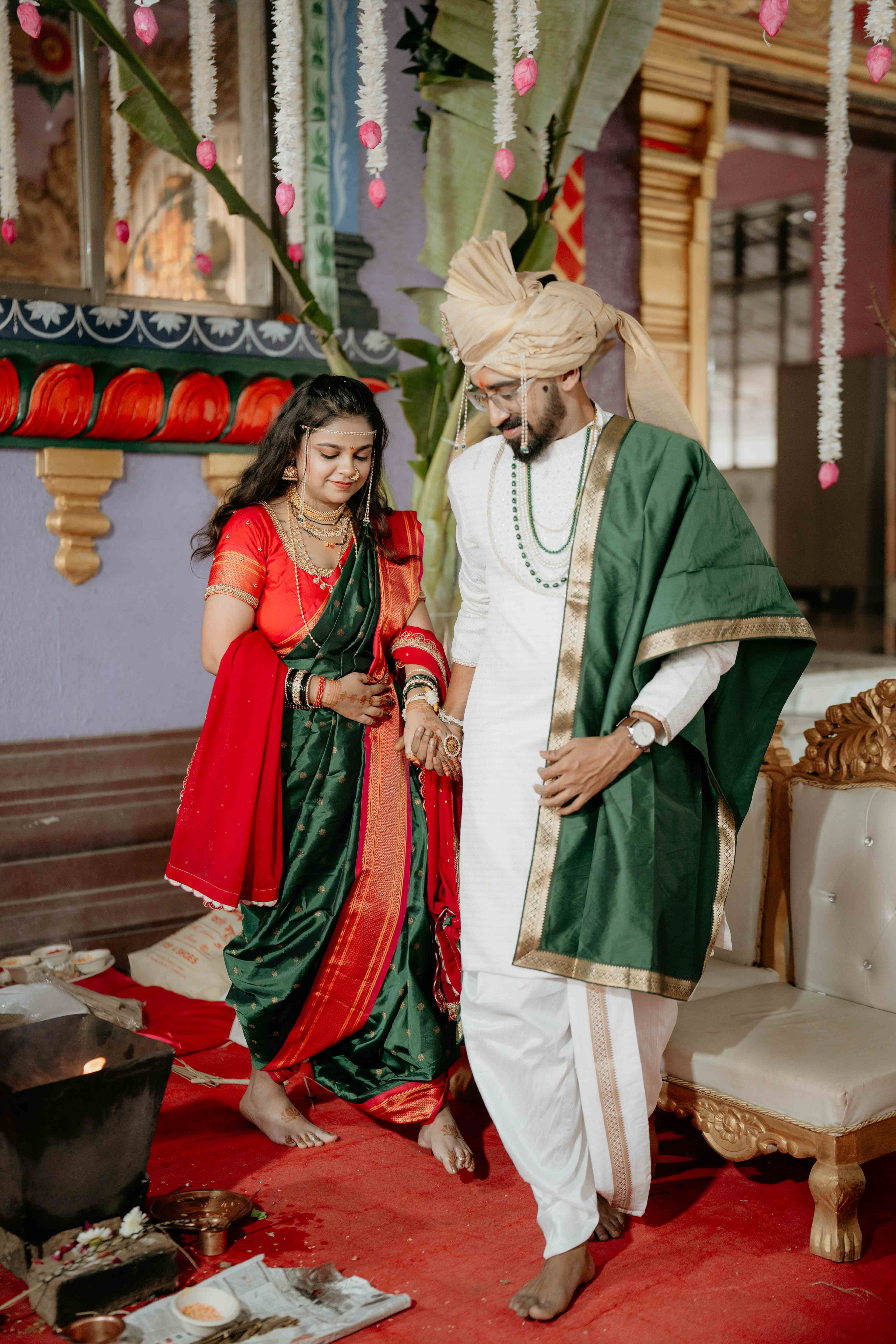 Standing beneath the intricately carved Gopuram, the couple perfectly mirrored the temple’s elegance. Deepali, draped in a rich forest green Nauvari, and Abhinav, in his classic white and green traditional attire, brought a sense of calm and grace to the vivid red and gold temple pillars.