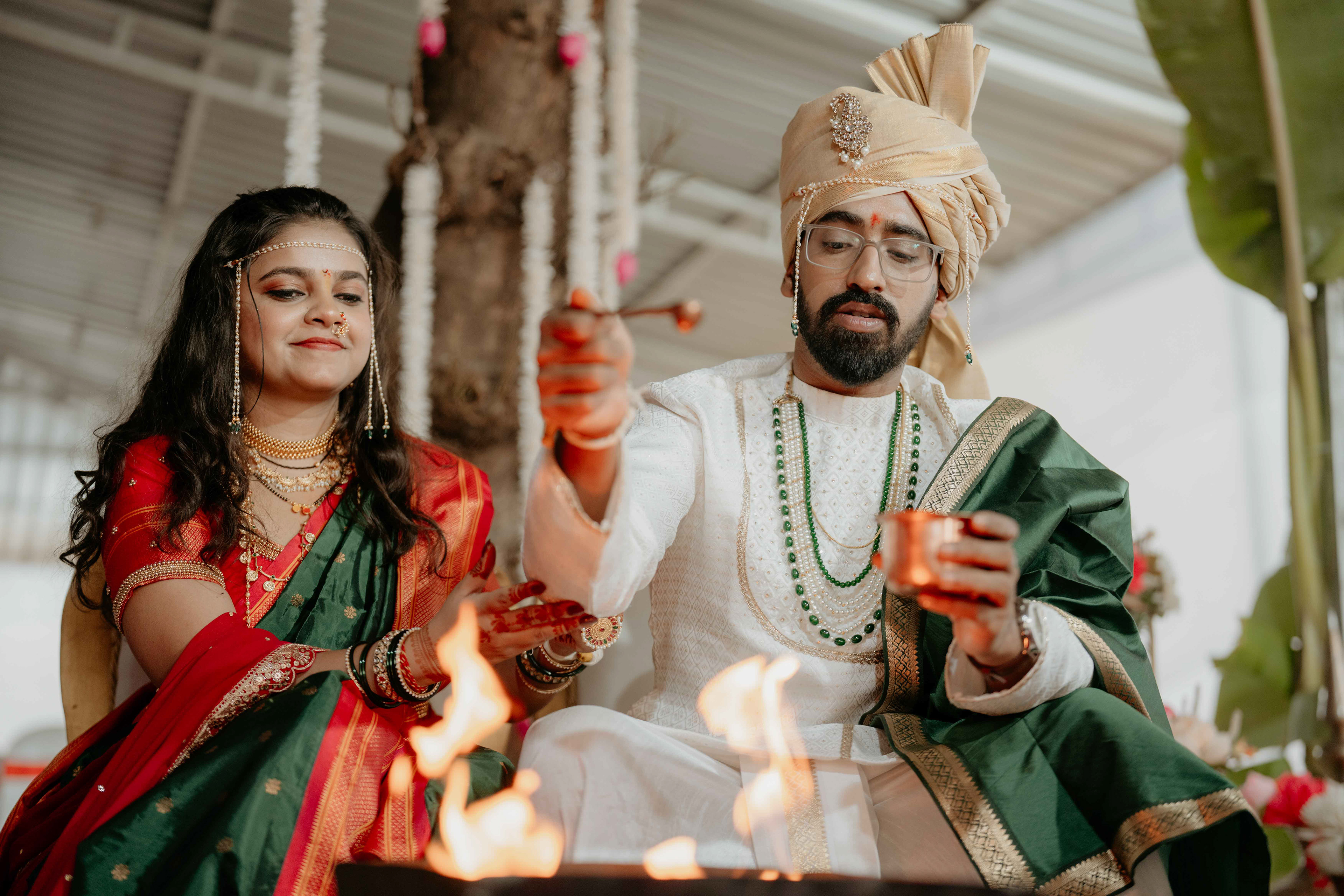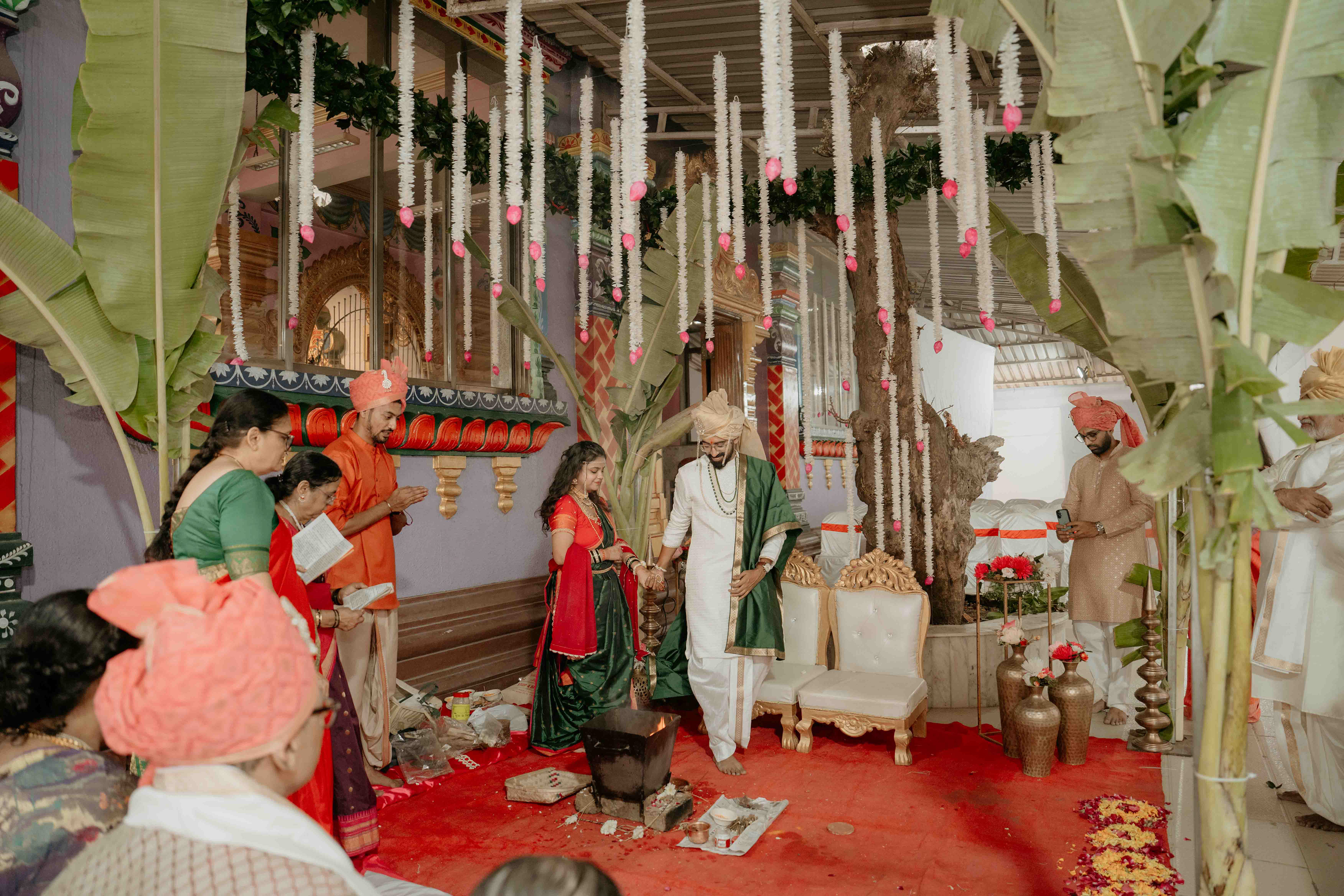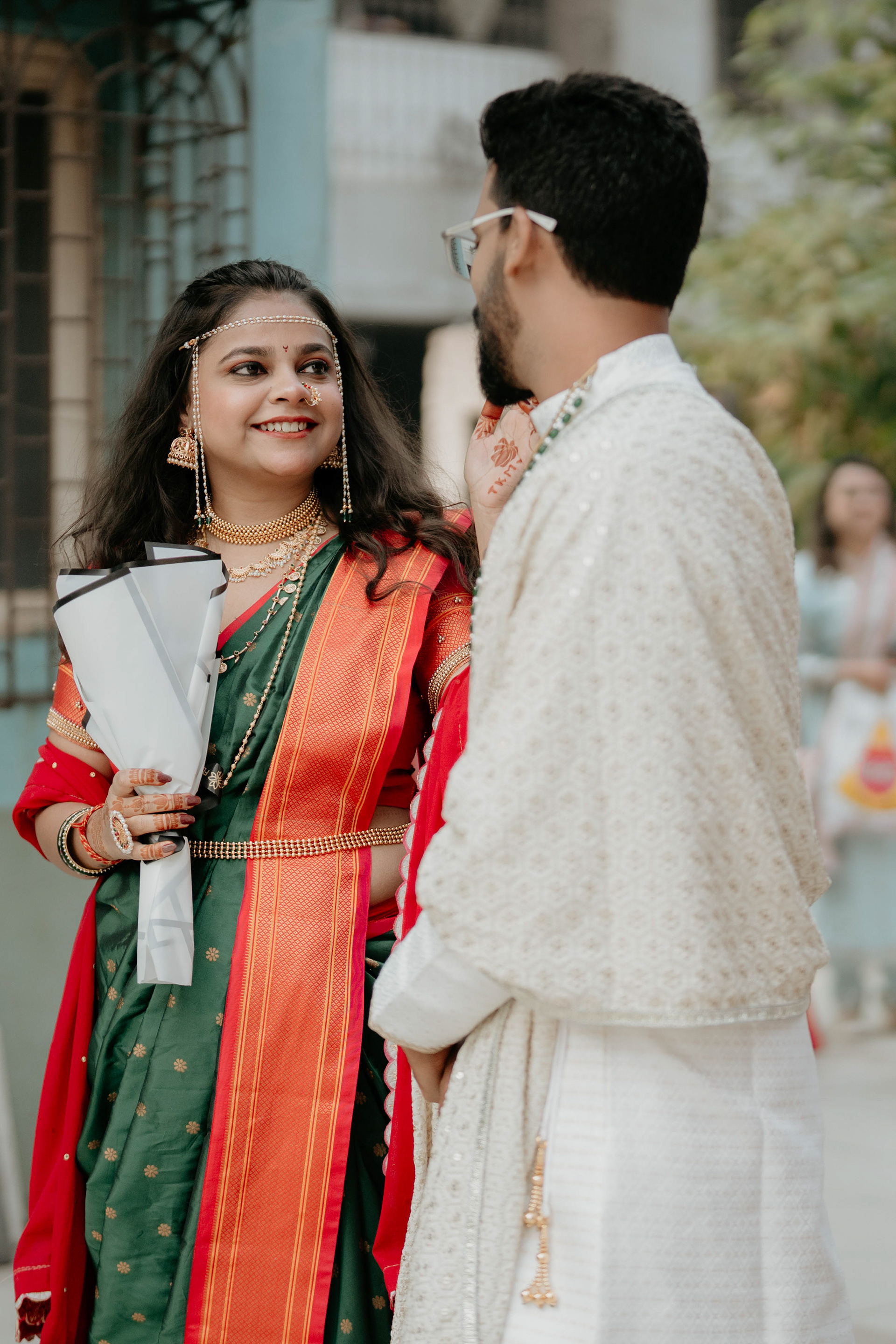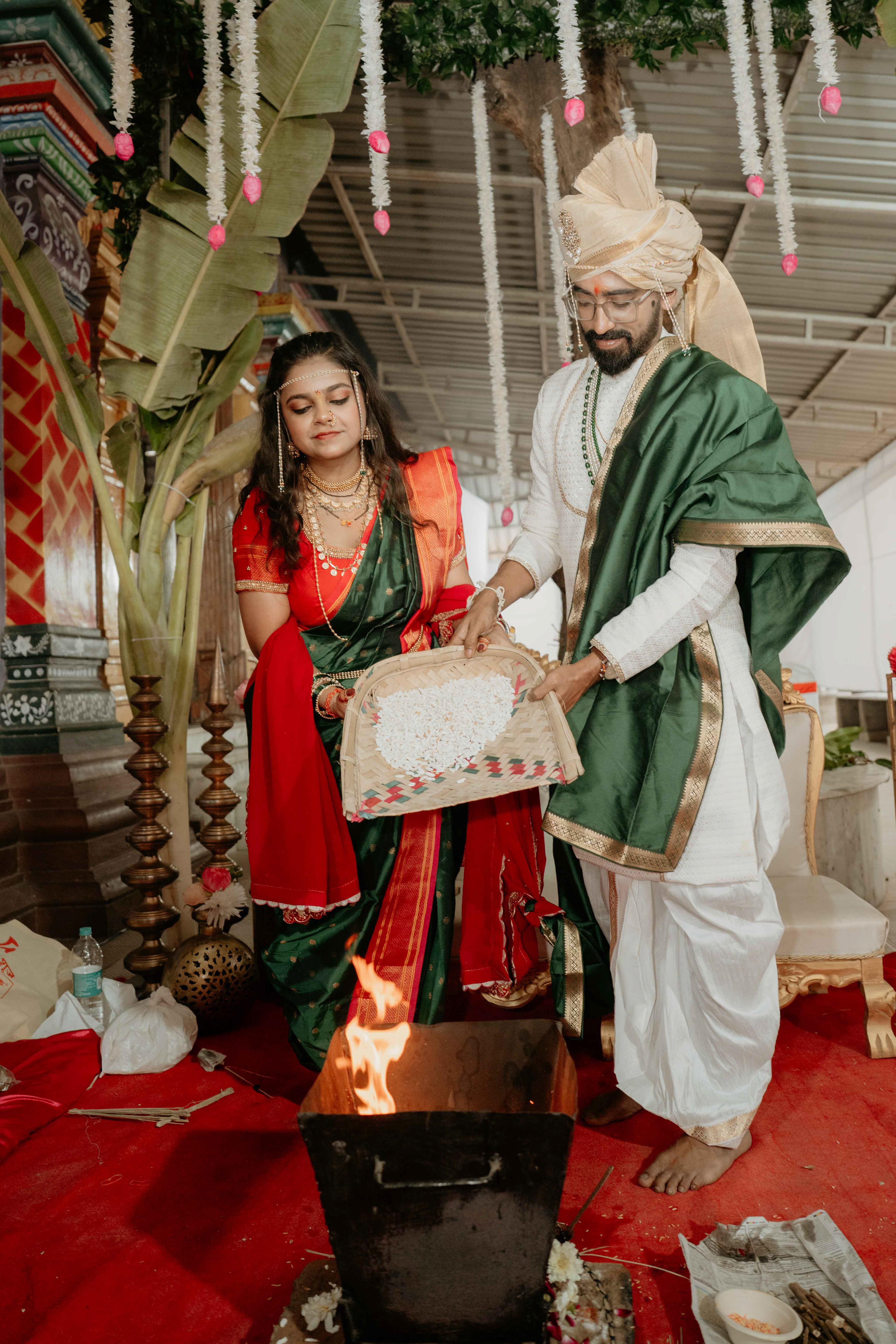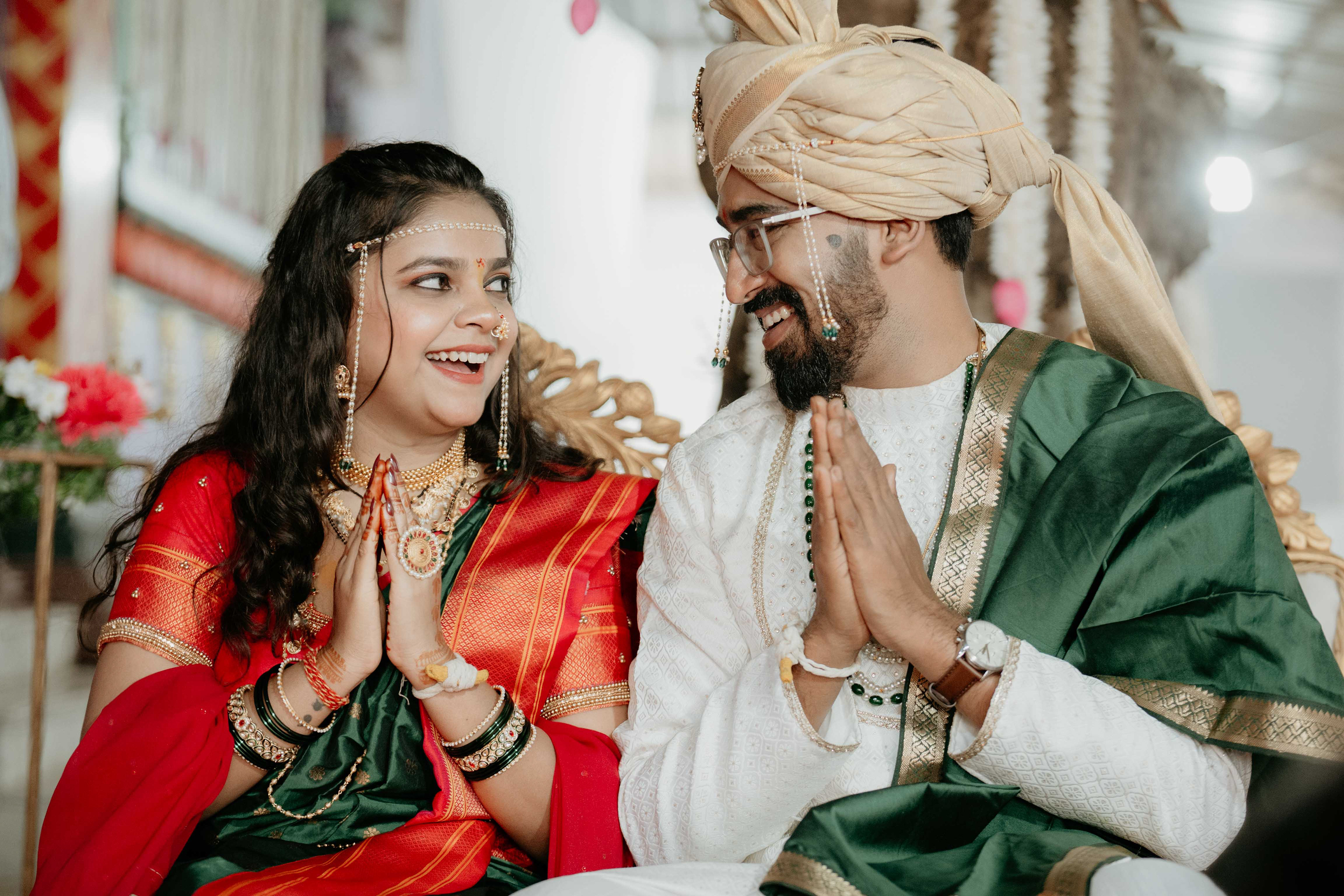 Standing beneath the intricately carved Gopuram, the couple perfectly mirrored the temple’s elegance. Deepali, draped in a rich forest green Nauvari, and Abhinav, in his classic white and green traditional attire, brought a sense of calm and grace to the vivid red and gold temple pillars.