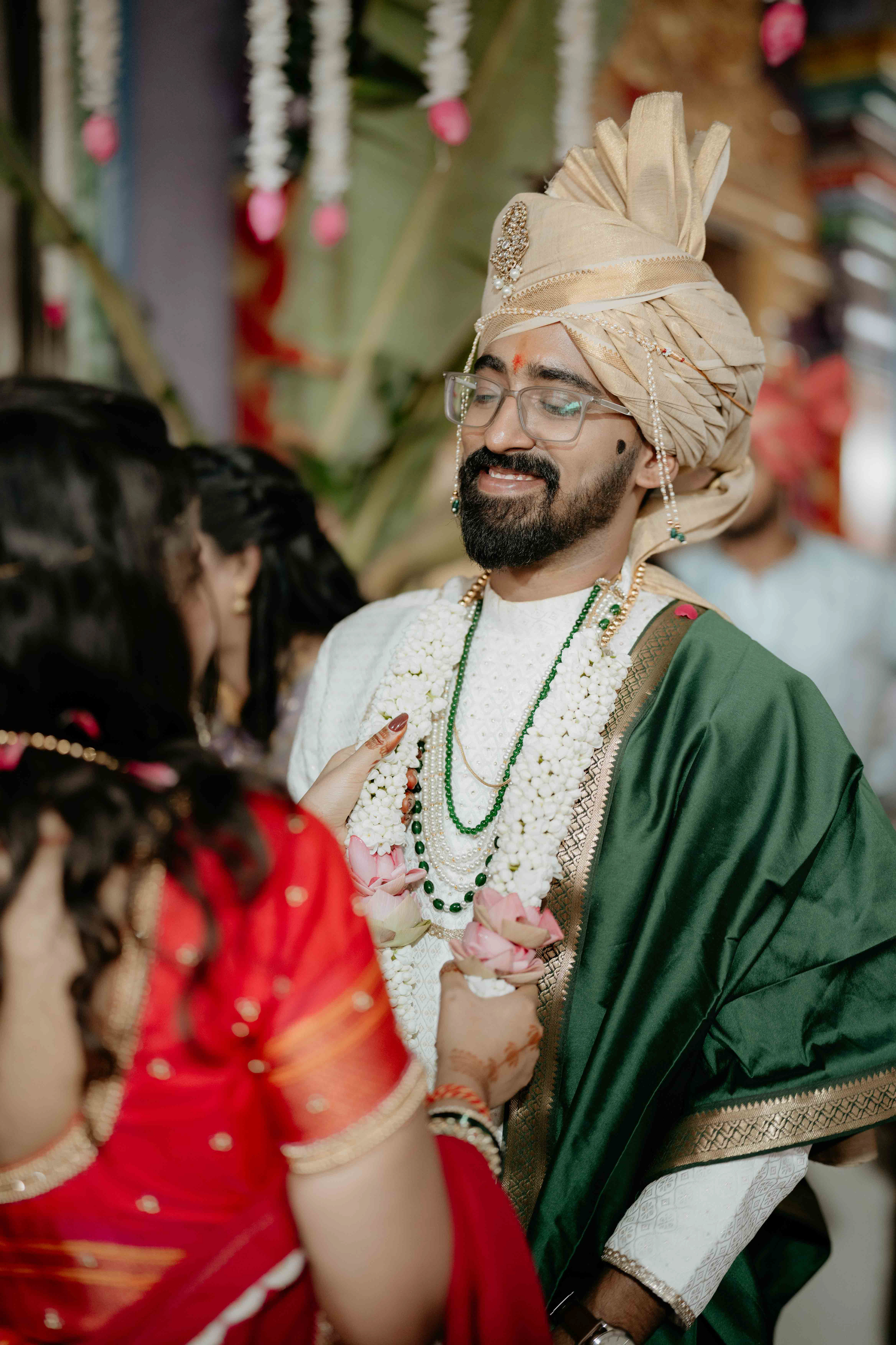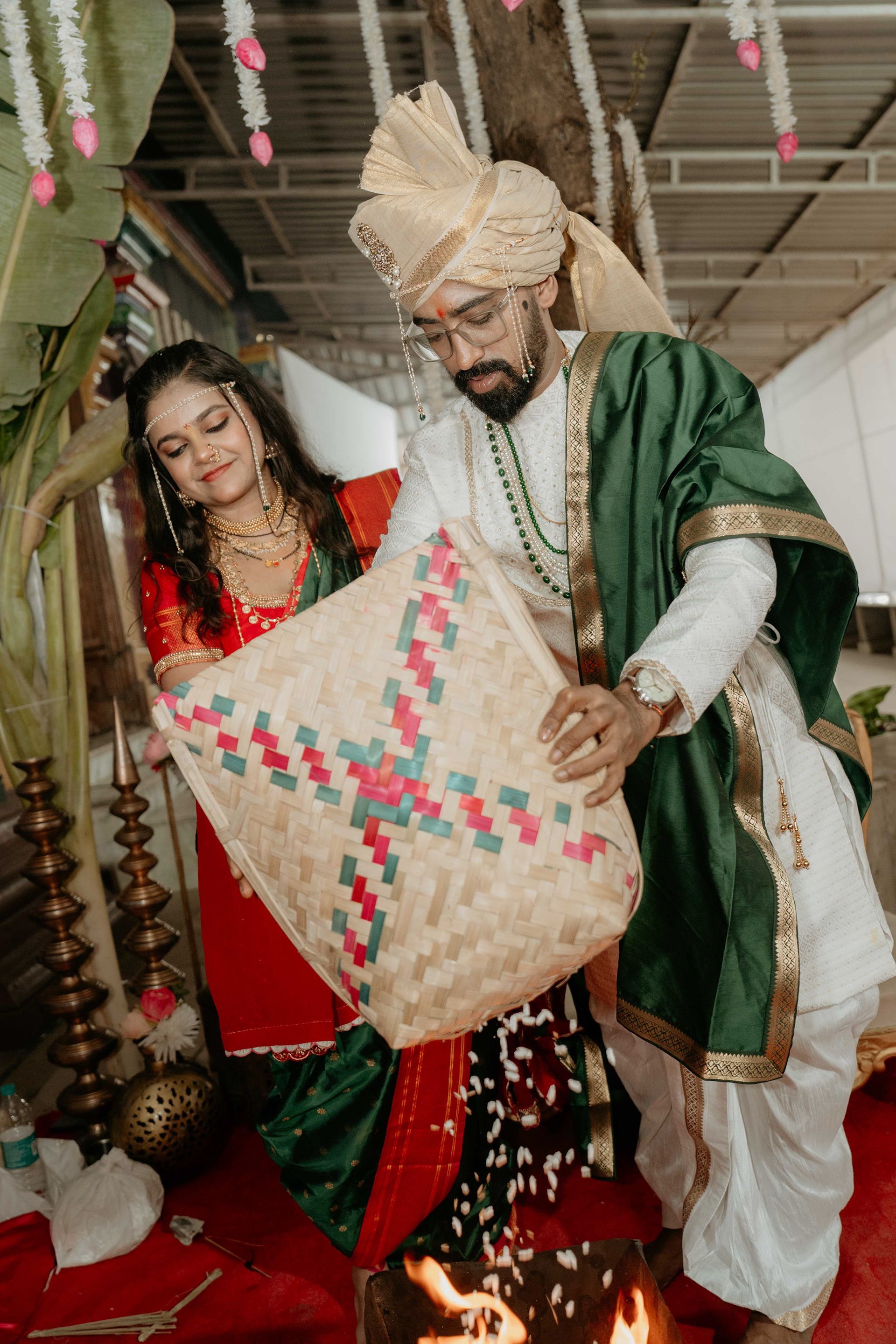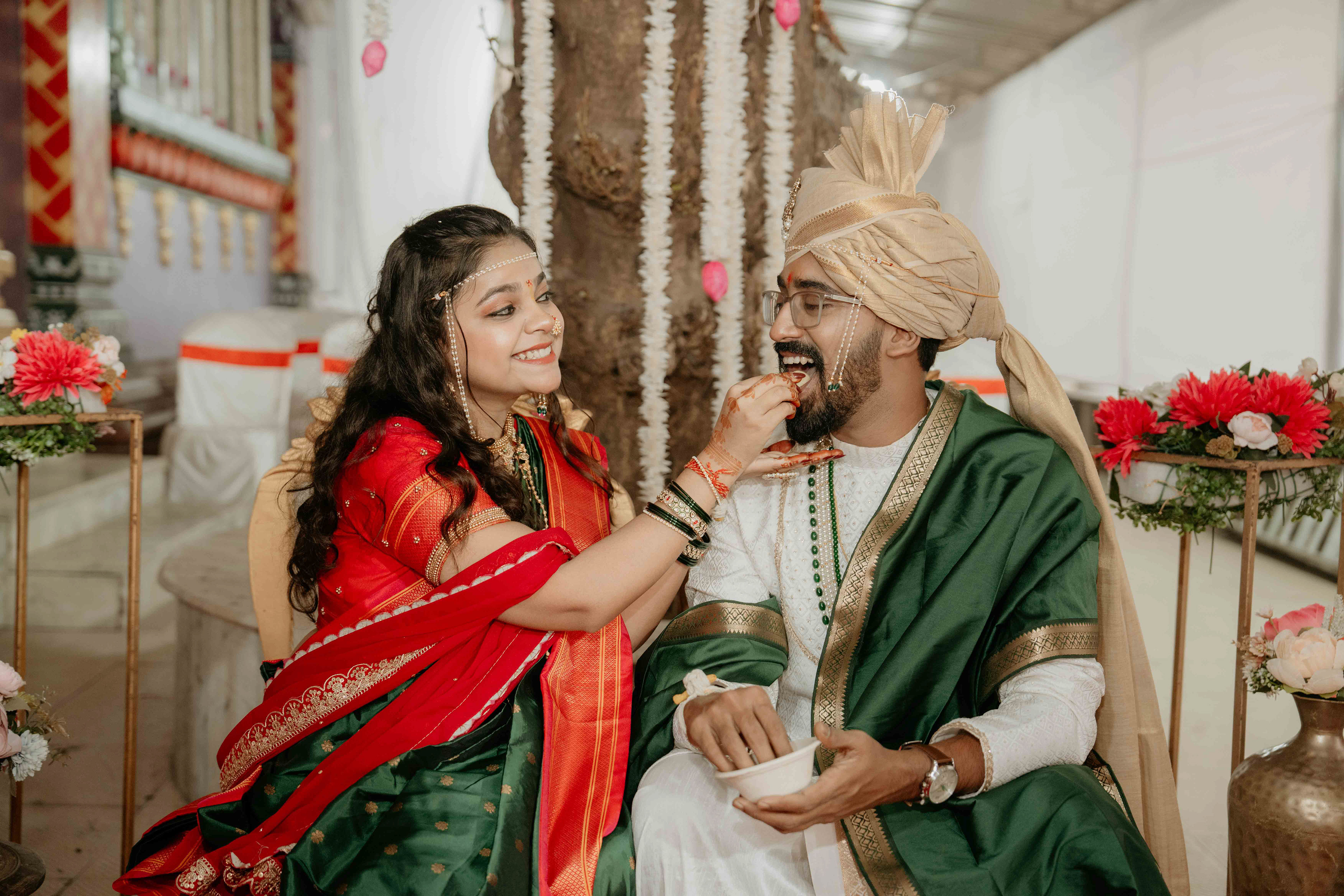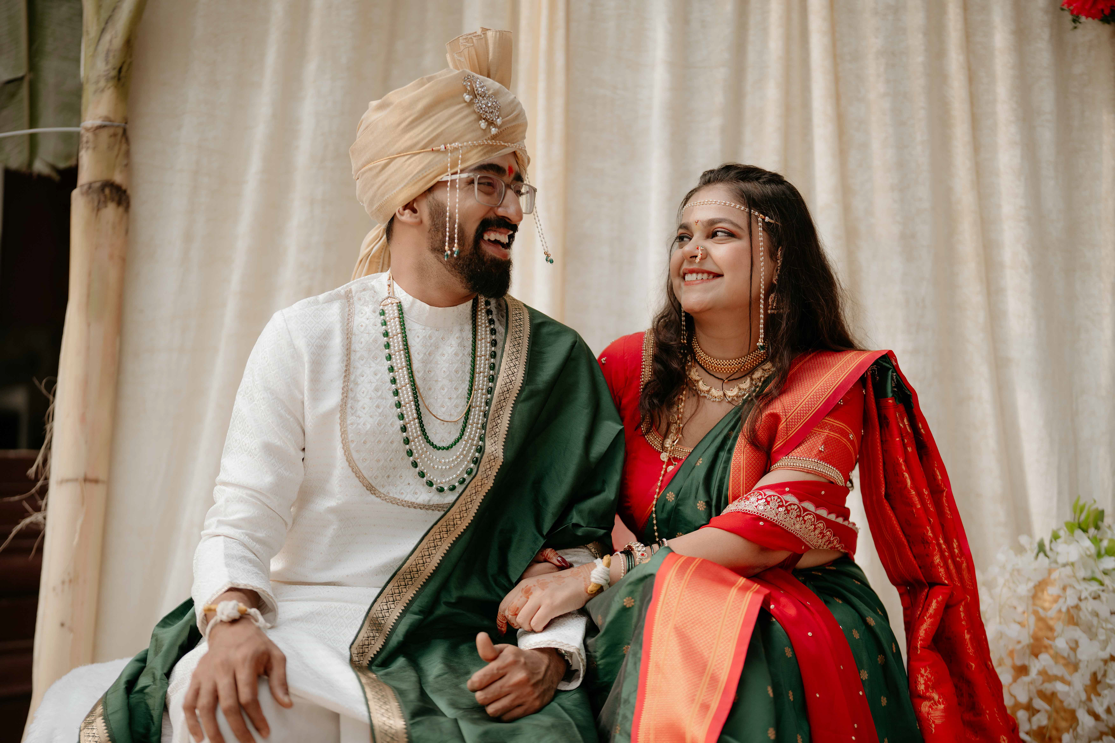 Standing beneath the intricately carved Gopuram, the couple perfectly mirrored the temple’s elegance. Deepali, draped in a rich forest green Nauvari, and Abhinav, in his classic white and green traditional attire, brought a sense of calm and grace to the vivid red and gold temple pillars.