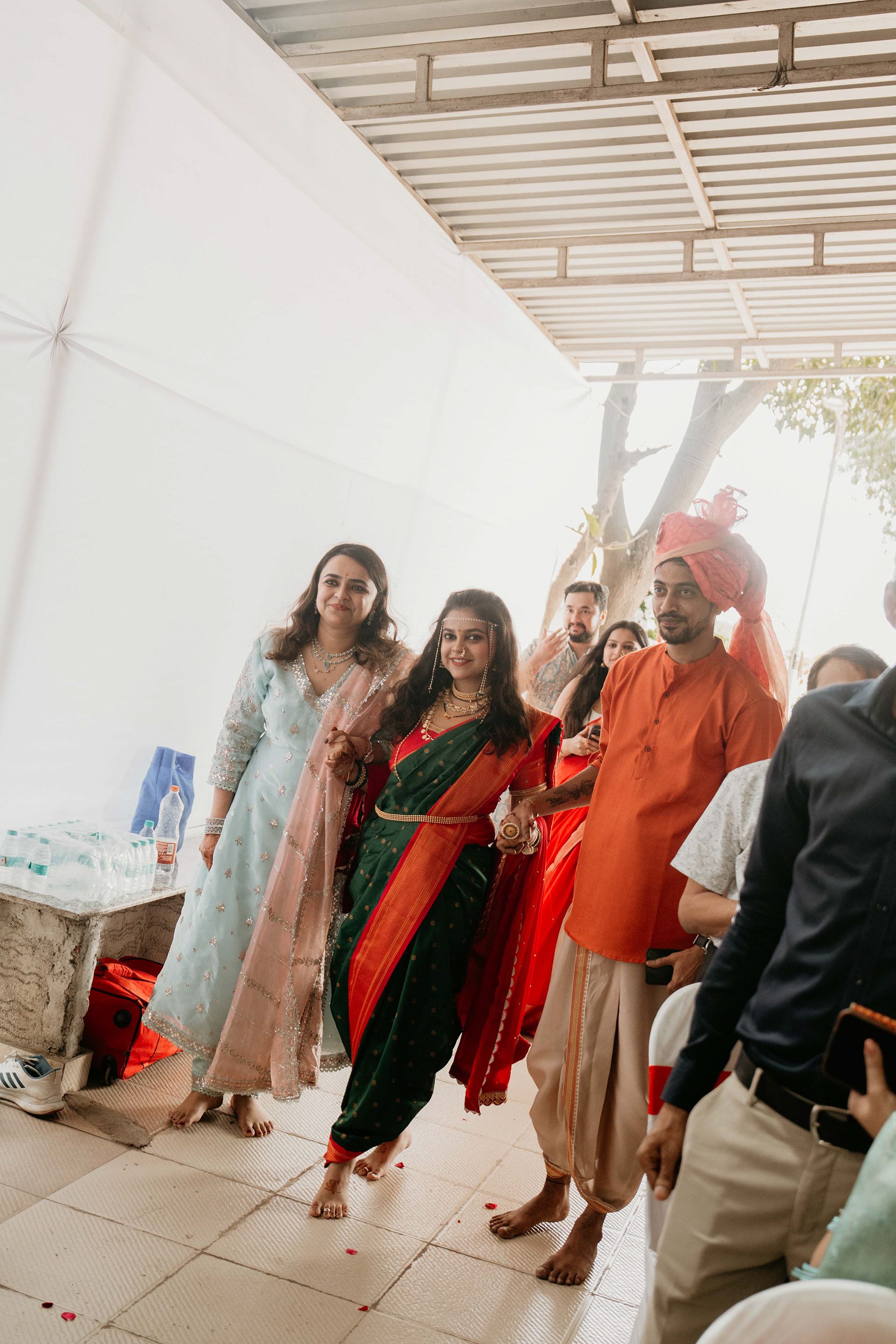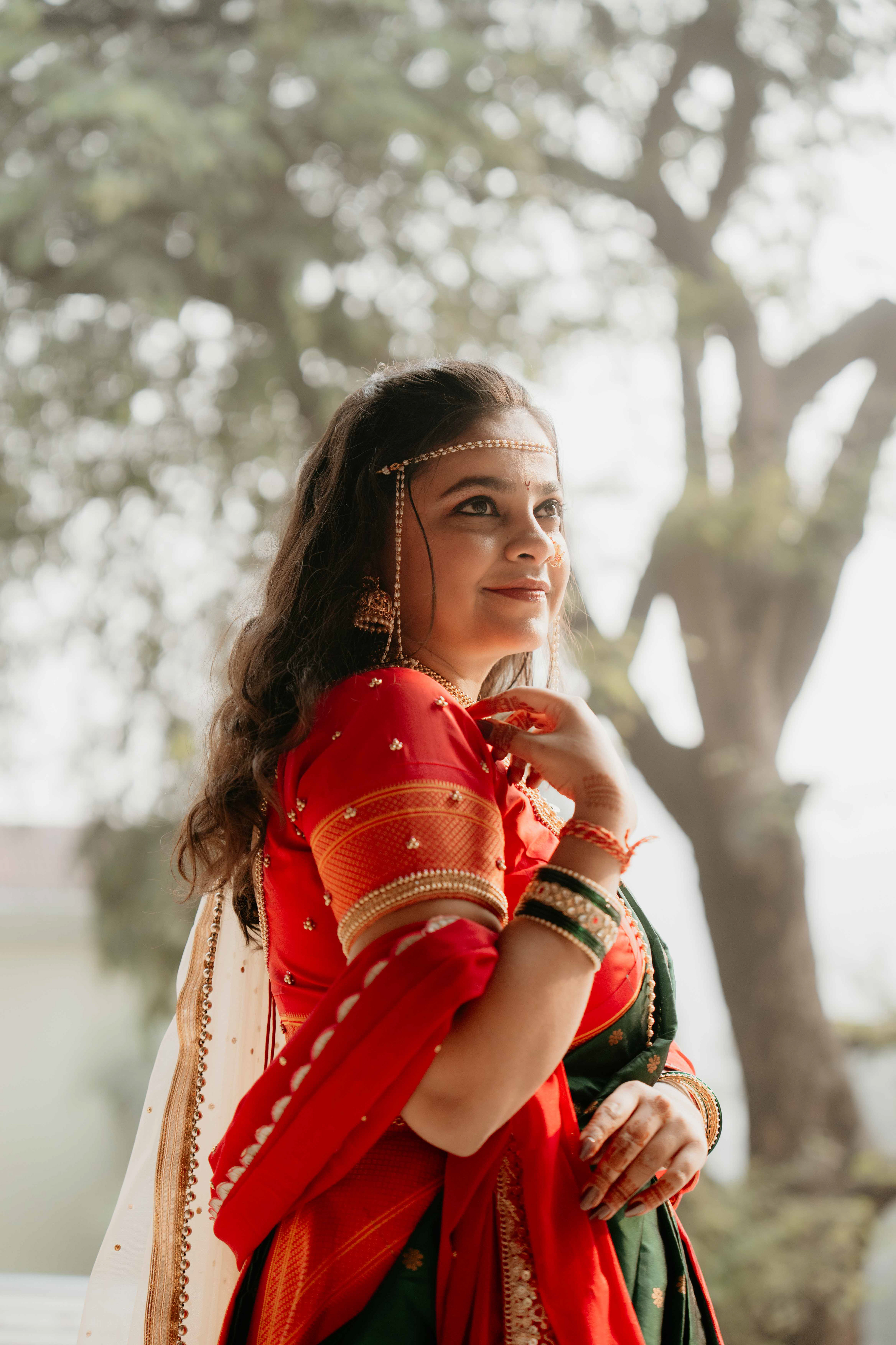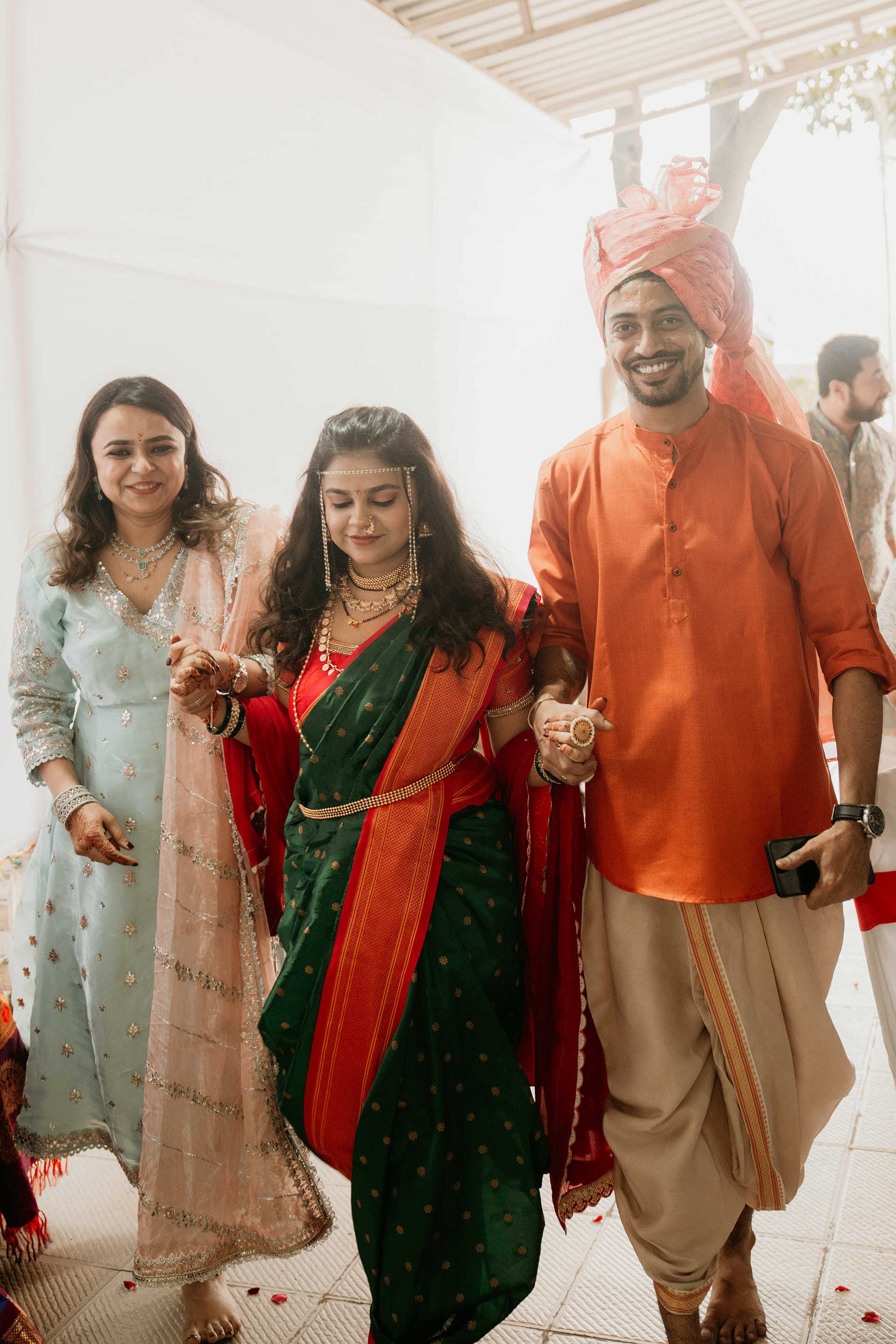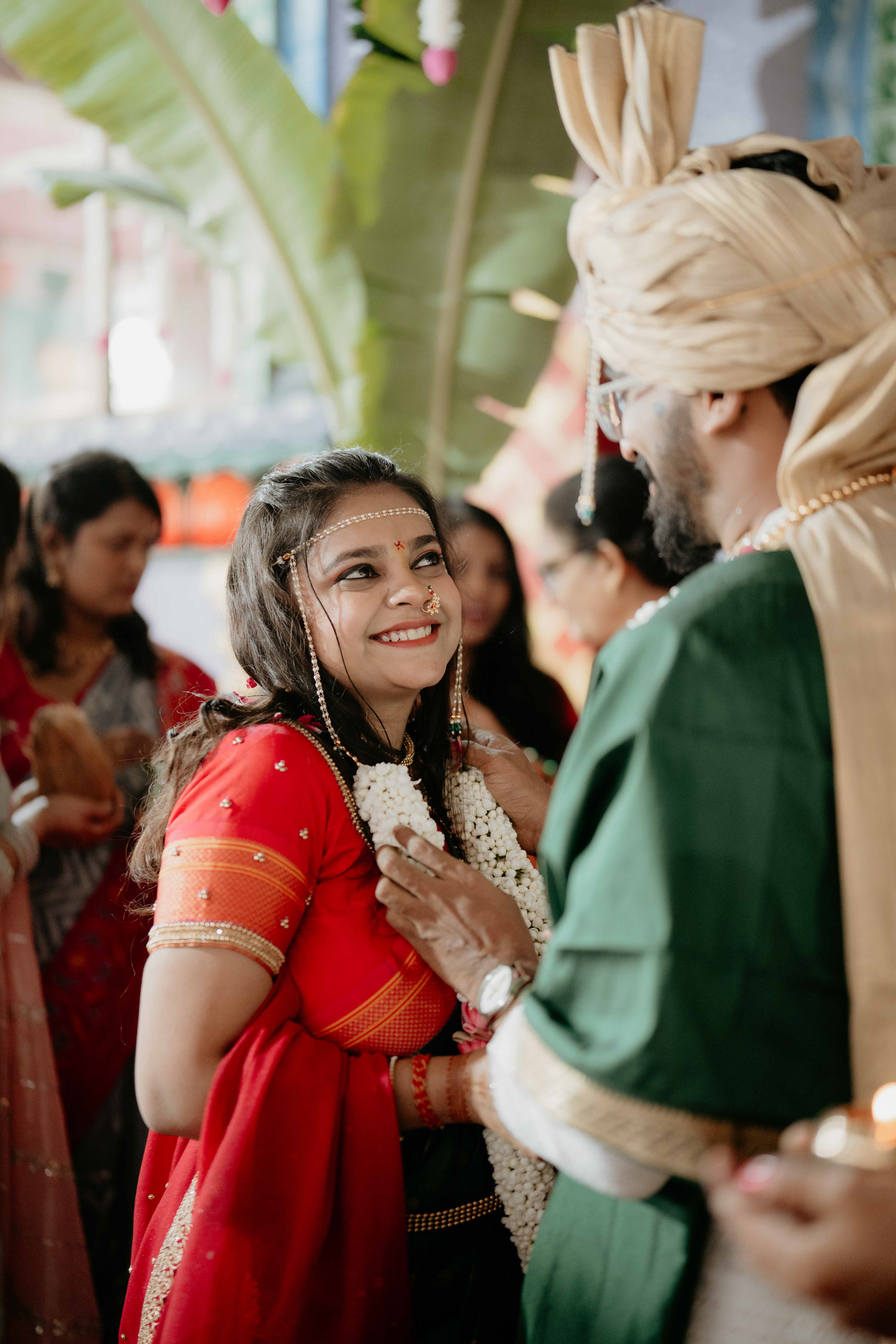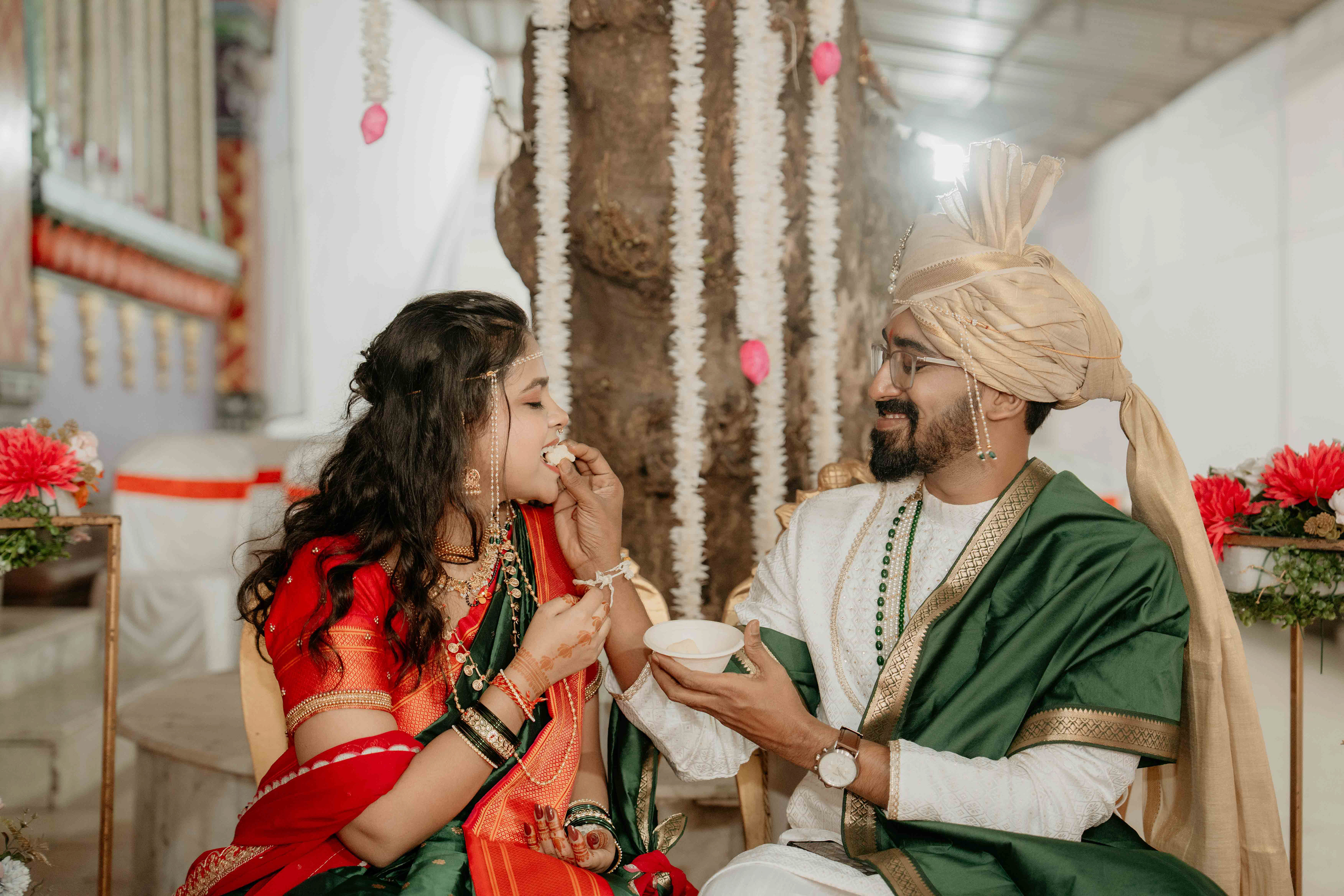 Standing beneath the intricately carved Gopuram, the couple perfectly mirrored the temple’s elegance. Deepali, draped in a rich forest green Nauvari, and Abhinav, in his classic white and green traditional attire, brought a sense of calm and grace to the vivid red and gold temple pillars.