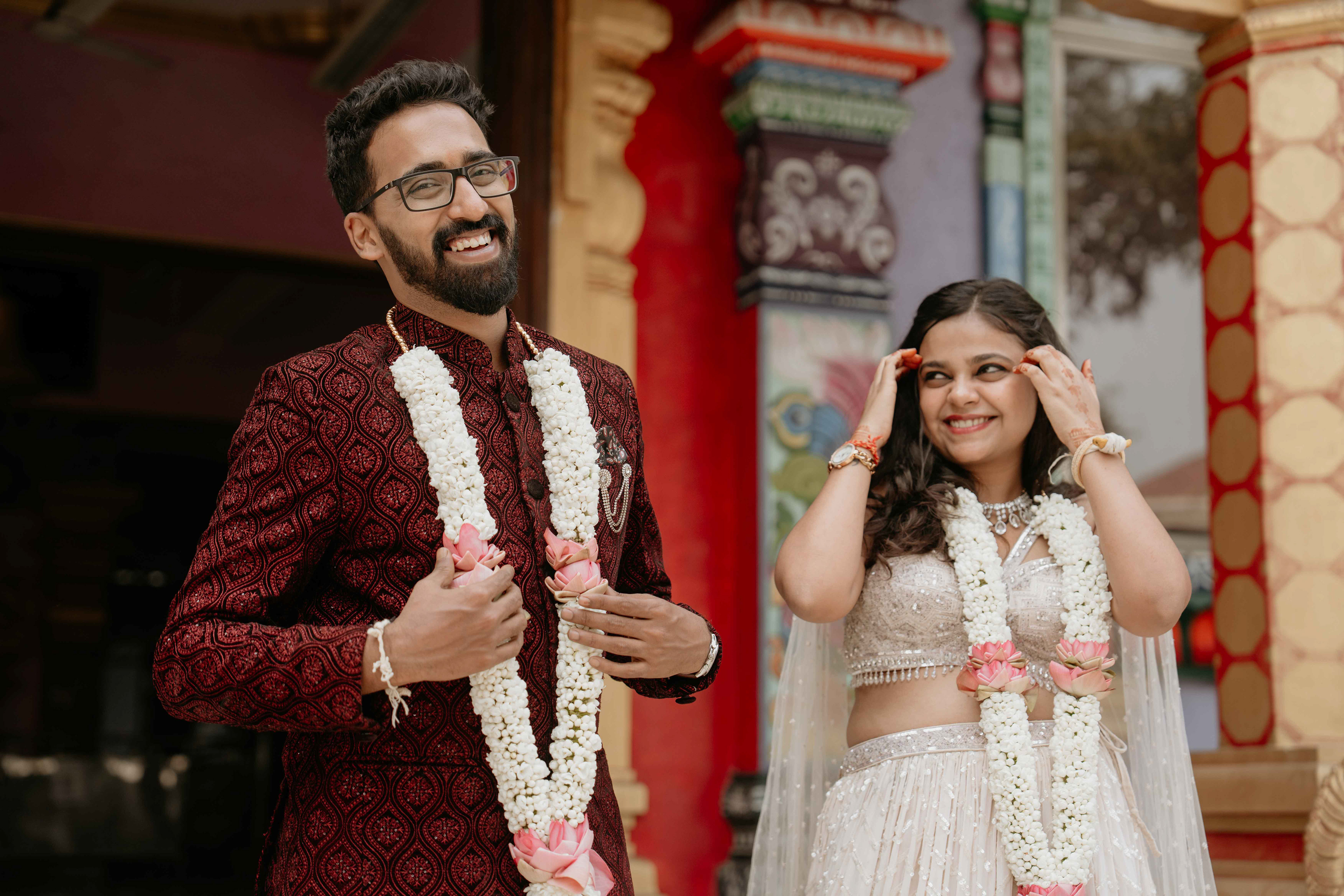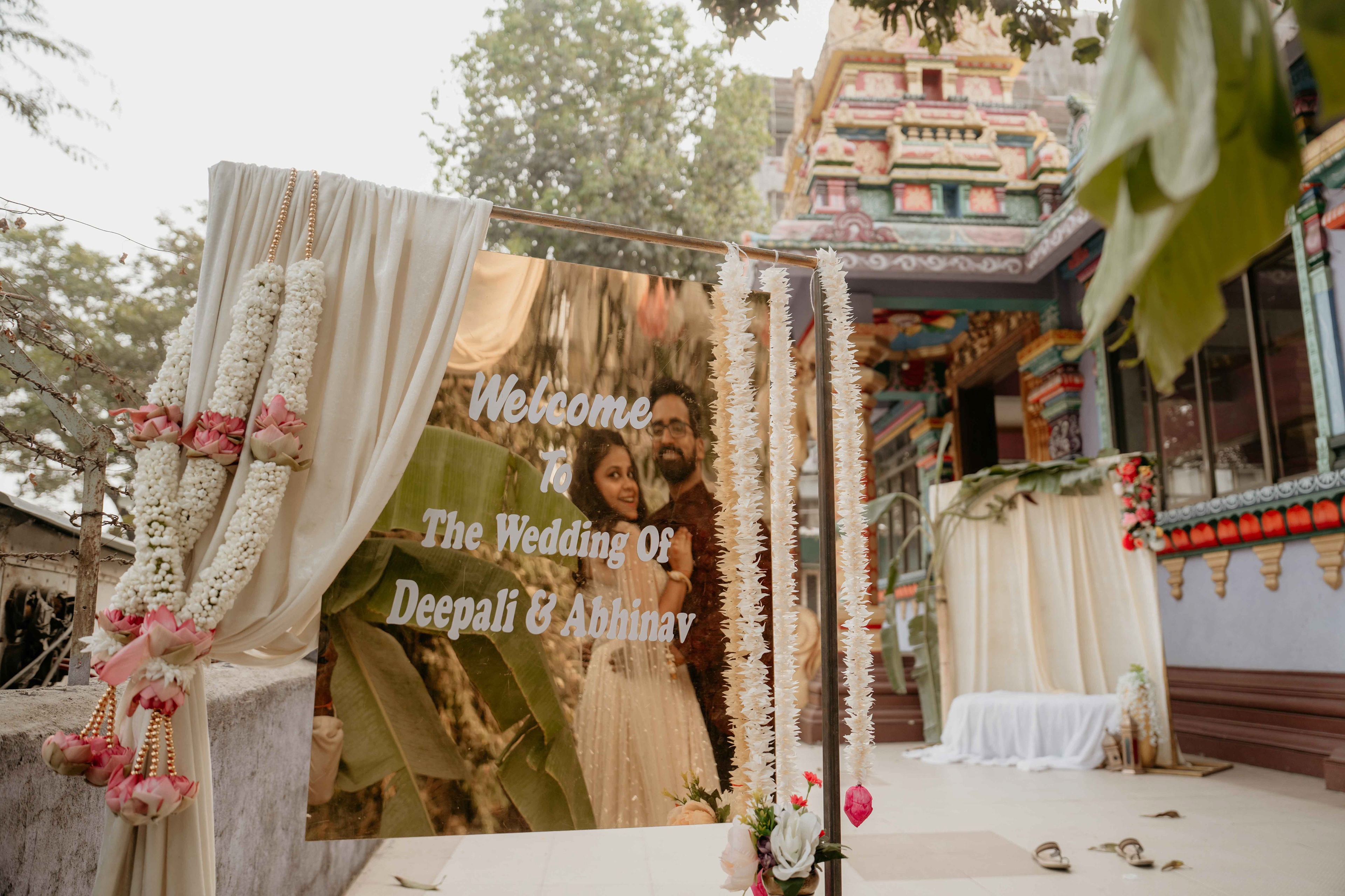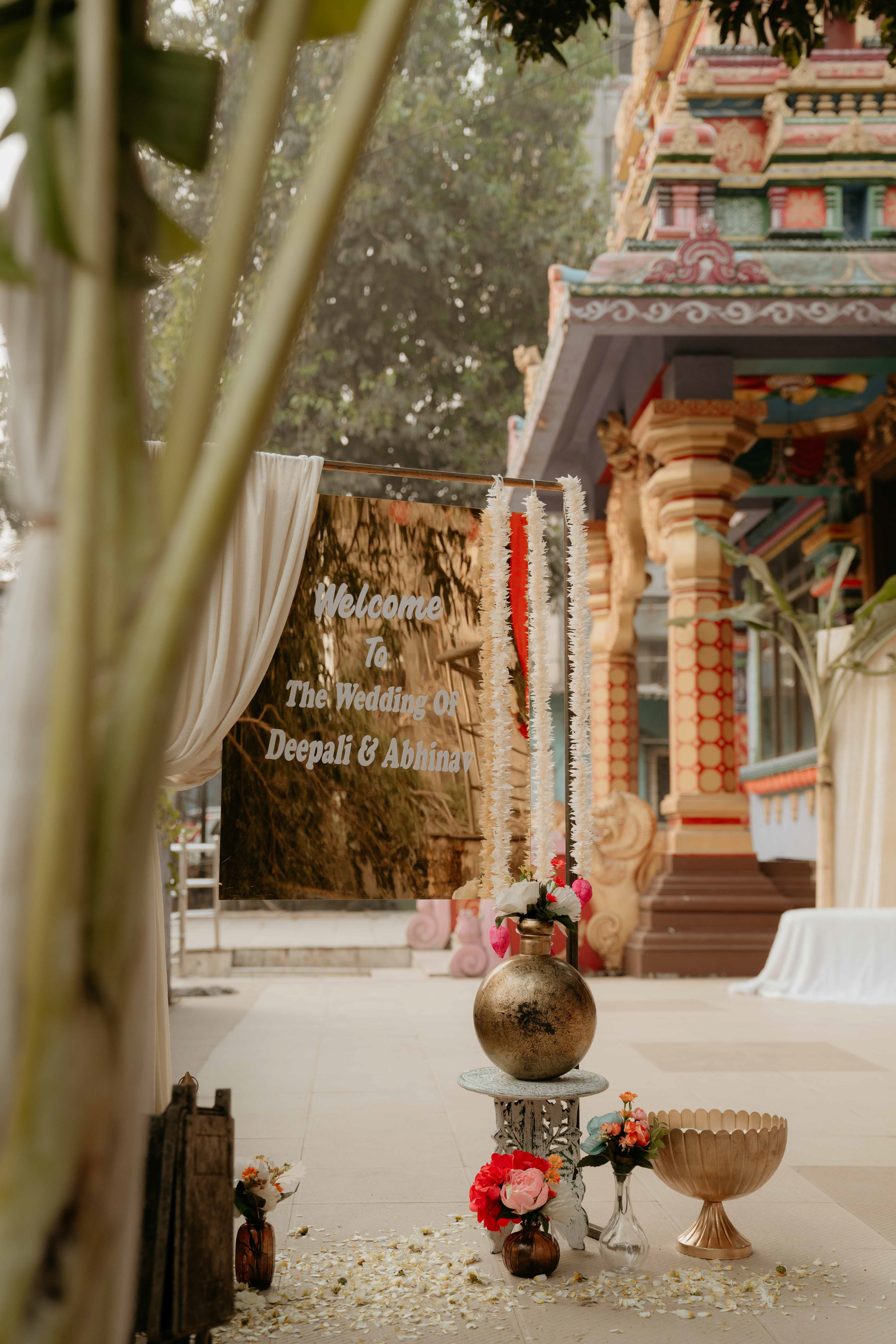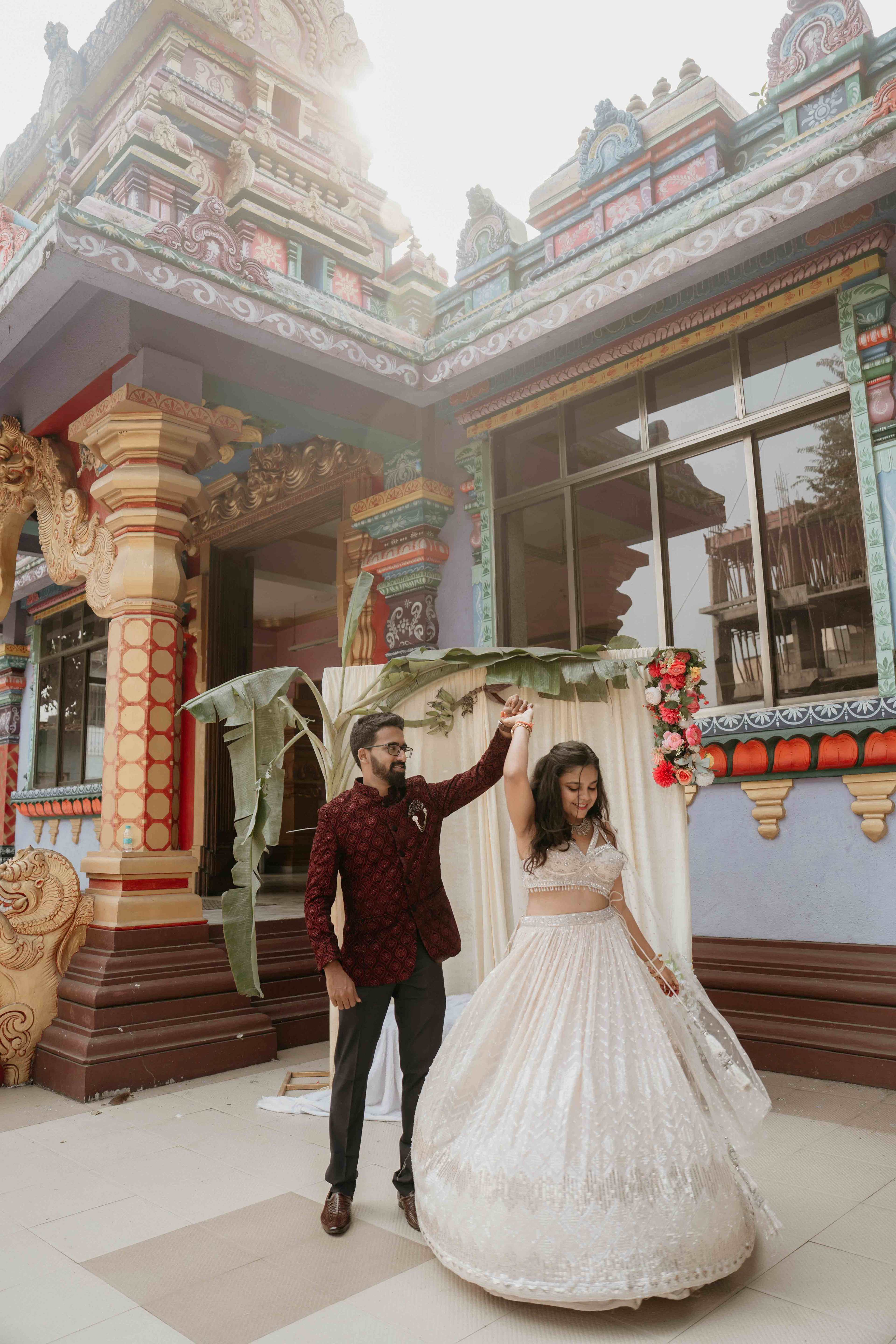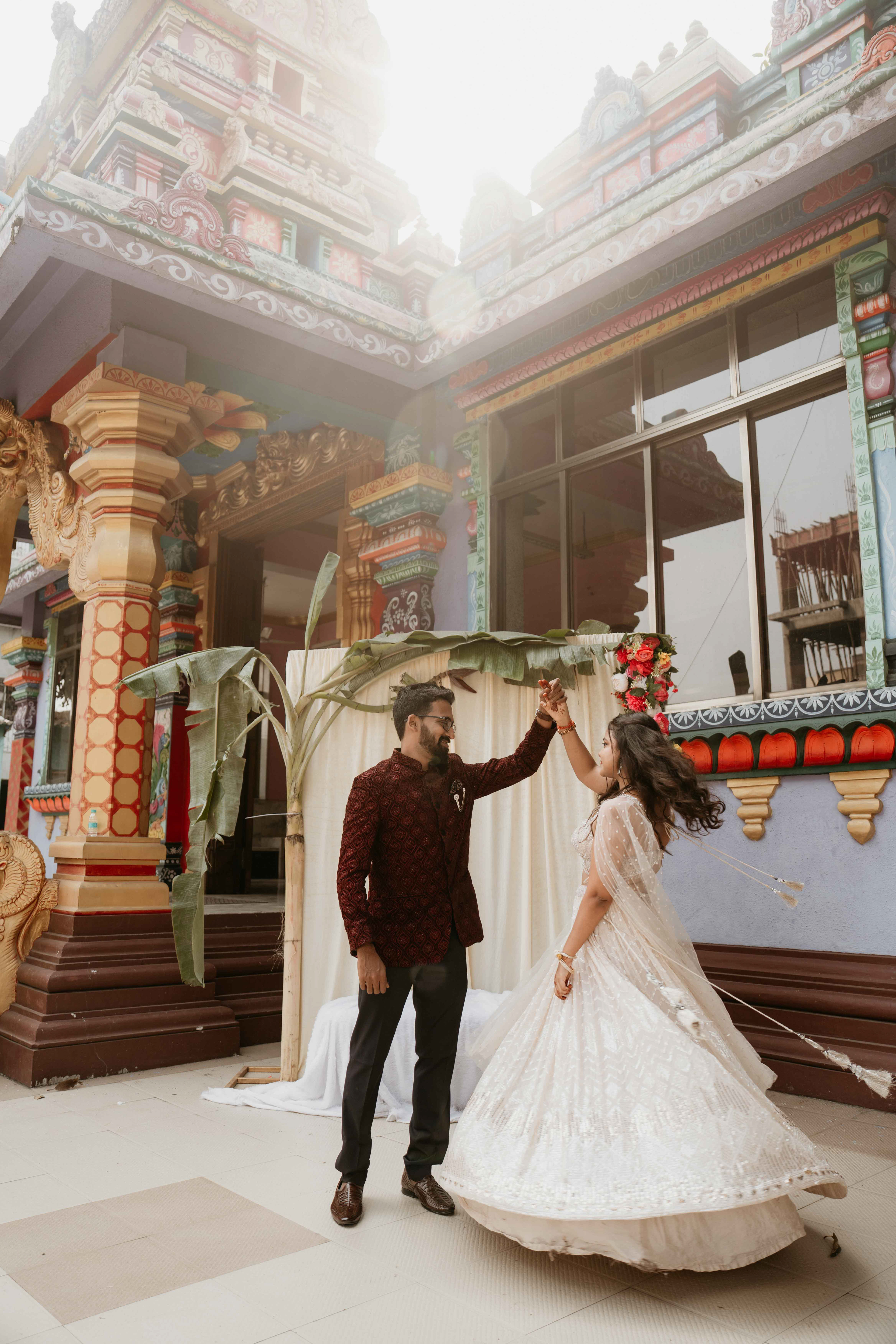 There is a unique magic that happens when heritage meets a sacred sanctuary. For Deepali and Abhinav, their wedding journey led them to the vibrant and soul-stirring Govardhani Mata Mandir. While their roots are deeply Maharashtrian, the temple’s South Indian-inspired architecture provided a grand, colorful, and spiritually rich backdrop for their union.